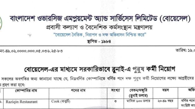 Are you looking for a legitimate and low-cost way to work abroad? The Bangladesh Overseas Employment and Services Limited (BOESL) has released a new recruitment notification for skilled workers in Brunei Darussalam.