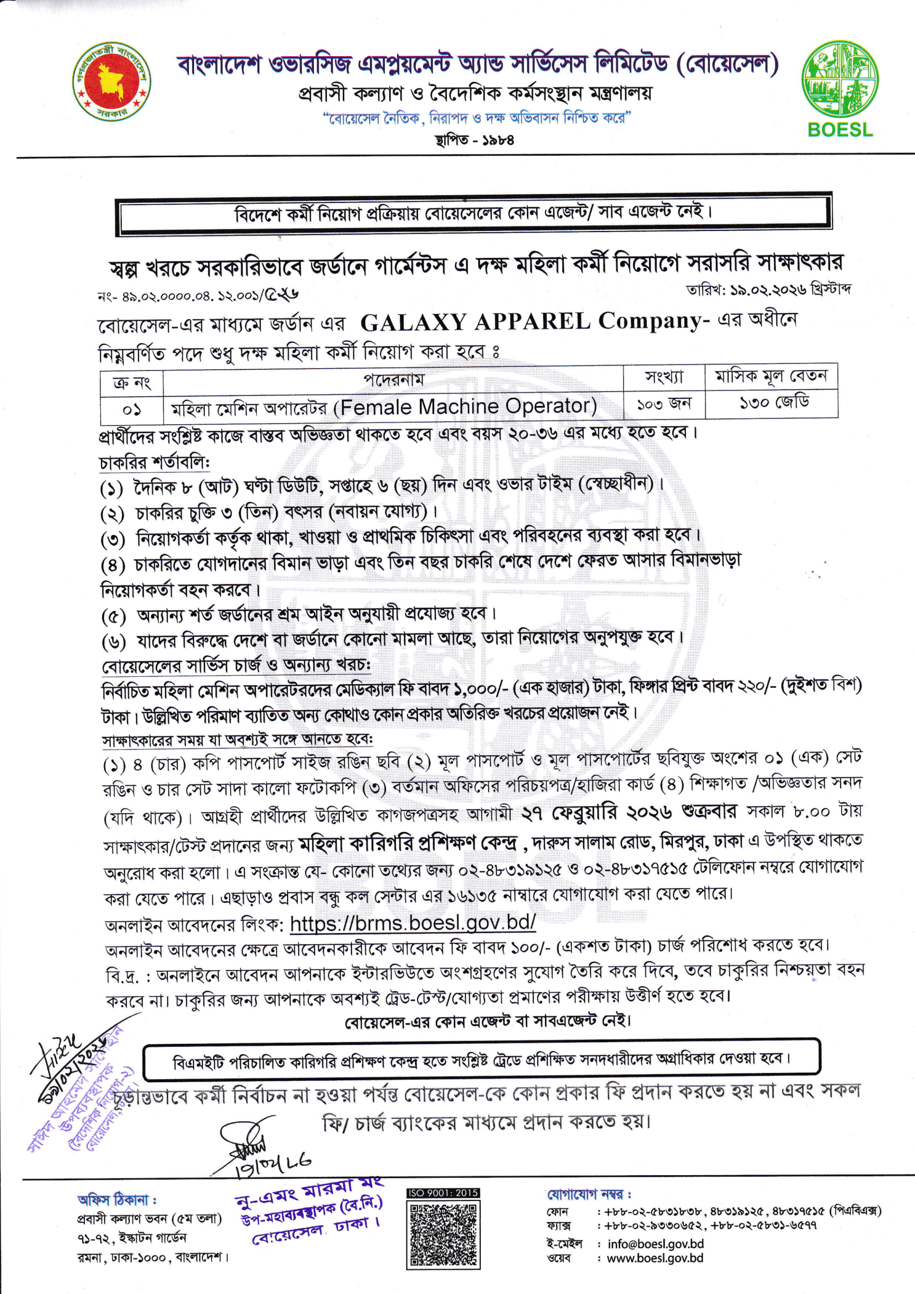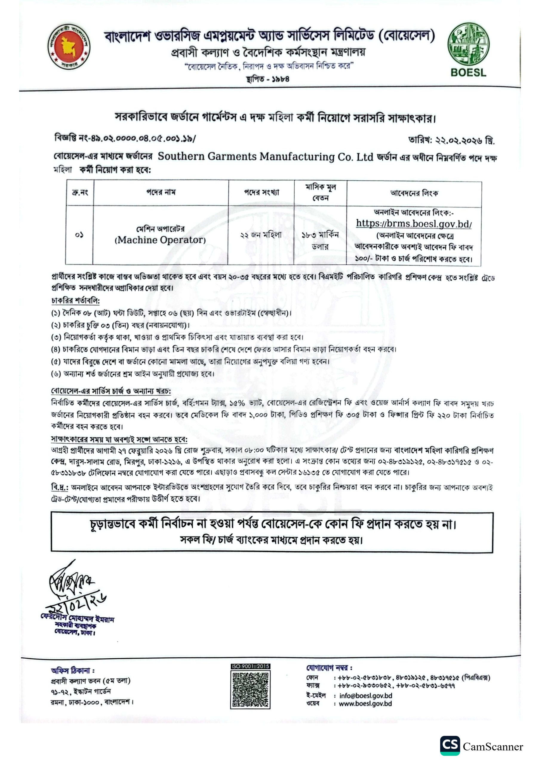Visit the BOESL website (https://brms.boesl.gov.bd/) to verify the latest Jordan Job Circular. Do not rely on third-party brokers.