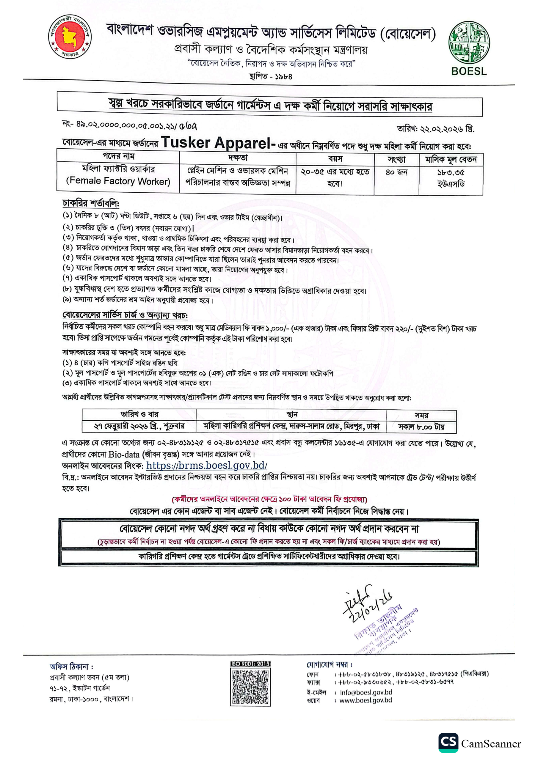 For most garment sector jobs, BOESL conducts a “Walk-in Interview.” You must bring your Passport, 4 copies of passport-sized photos, and experience certificates to the designated testing center (usually Bangladesh-Korea Technical Training Center).