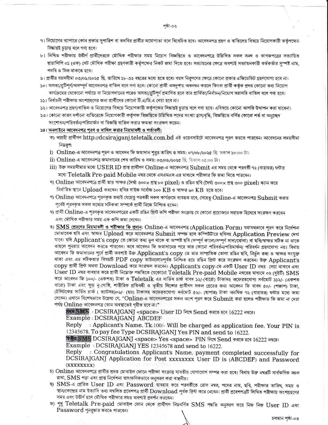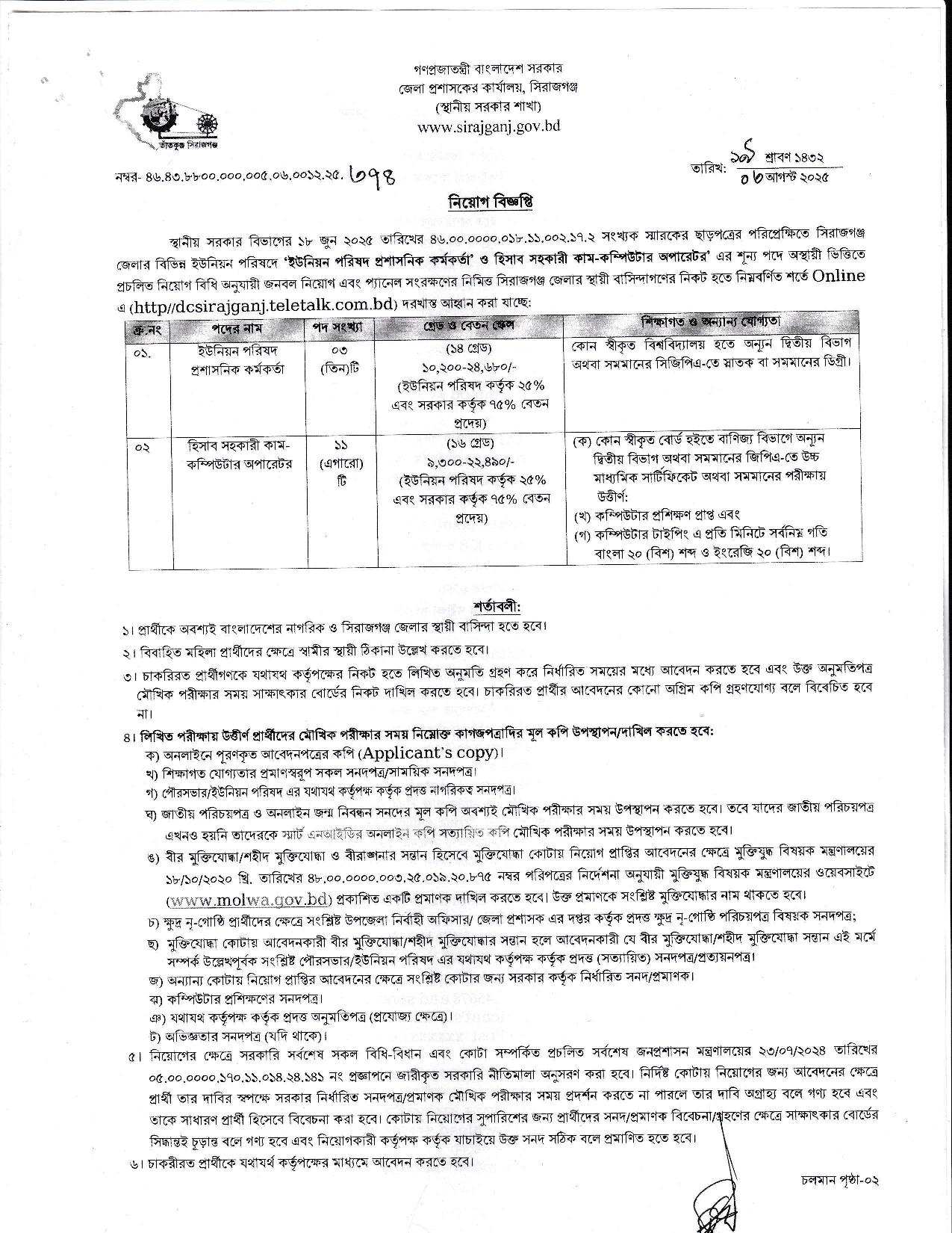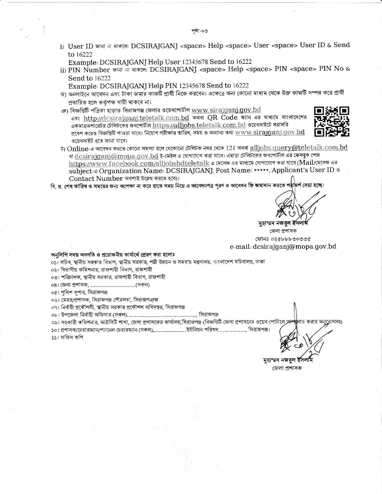 আবেদন প্রক্রিয়া: আগ্রহী প্রার্থীরা অনলাইনে http://dcsirajganj.teletalk.com.bd/dcsirajganj082025/ ওয়েবসাইটের মাধ্যমে আবেদন করতে পারবেন।