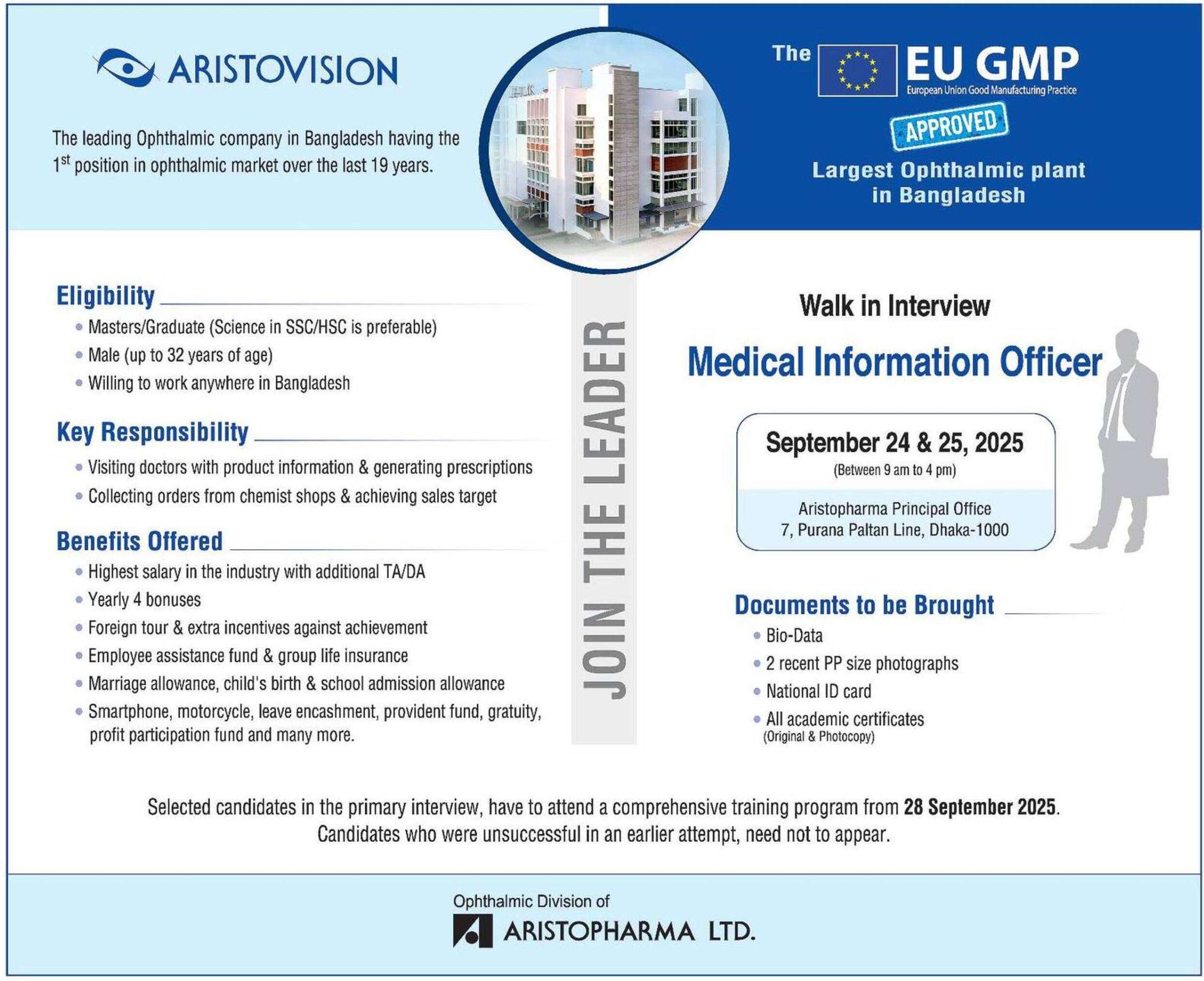 অ্যারিস্টোফার্মা লি. সম্প্রতি মেডিকেল ইনফরমেশন অফিসার পদে নিয়োগের জন্য বিজ্ঞপ্তি প্রকাশ করেছে। নিচে এই নিয়োগ সংক্রান্ত বিস্তারিত তথ্য তুলে ধরা হলো।