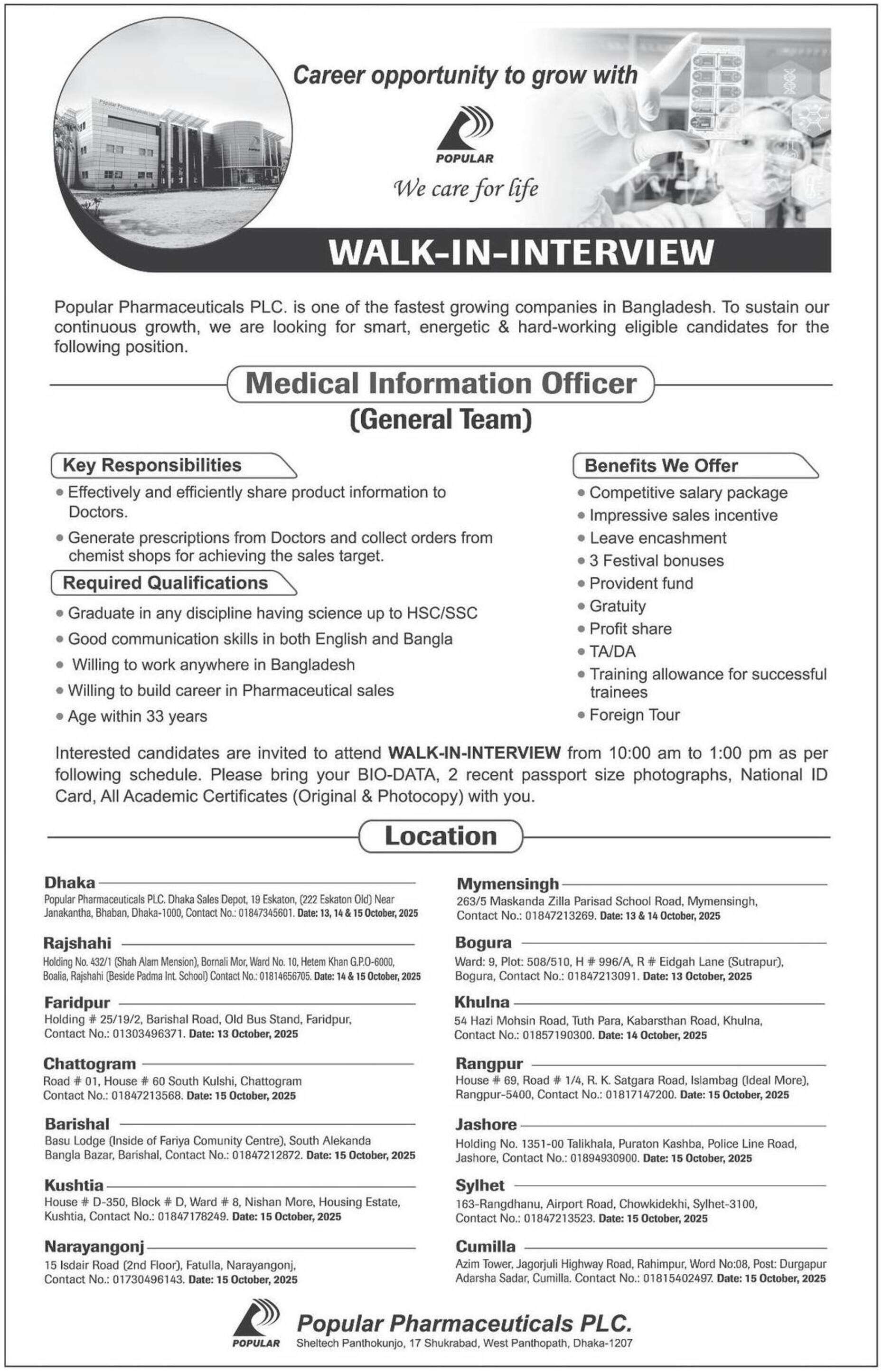 পপুলার ফার্মাসিউটিক্যালস পিএলসি-এর মেডিকেল অফিসার (জেনারেল টিম) পদের জন্য ওয়াক-ইন-ইন্টারভিউয়ের বিস্তারিত তথ্য, যা আপনার দেওয়া ছবি থেকে সংকলিত।
