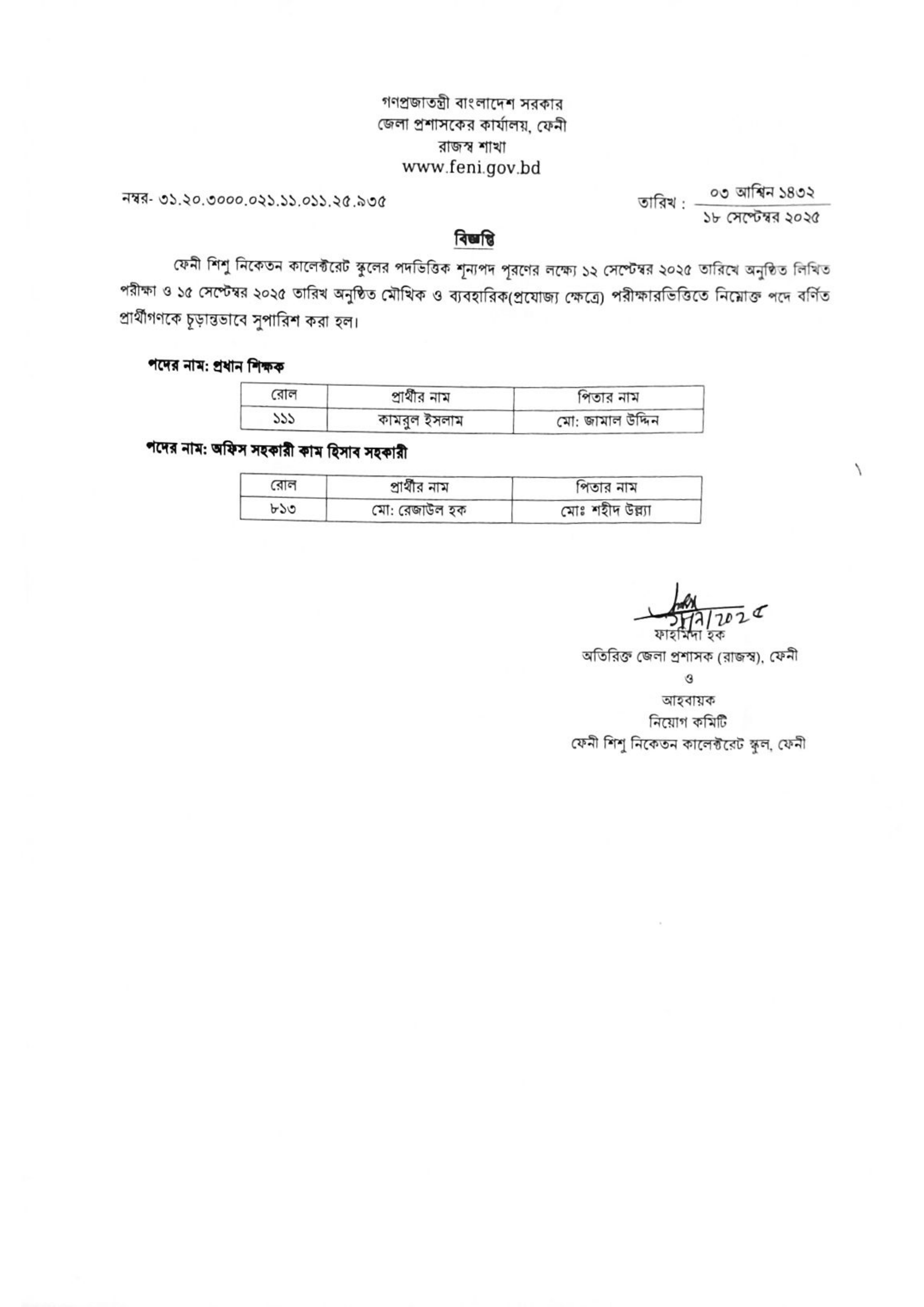 ফেনী শিশু নিকেতন কালেক্টরেট স্কুলে শূন্যপদ পূরণের লক্ষ্যে অনুষ্ঠিত নিয়োগ পরীক্ষার চূড়ান্ত সুপারিশ প্রকাশ করা হয়েছে।