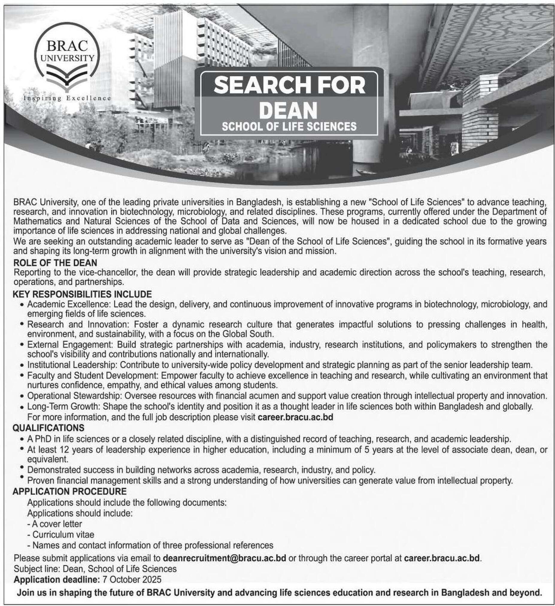 ব্র্যাক ইউনিভার্সিটি বাংলাদেশের অন্যতম শীর্ষস্থানীয় বেসরকারি বিশ্ববিদ্যালয়। বৈশ্বিক চ্যালেঞ্জ মোকাবিলা এবং জীবন বিজ্ঞানের উন্নয়নে অবদান রাখার লক্ষ্যে, ব্র্যাক ইউনিভার্সিটি বর্তমানে একটি নতুন স্কুল অফ লাইফ সায়েন্সেস প্রতিষ্ঠা করছে। এই স্কুলের জন্য একজন অভিজ্ঞ ও দূরদৃষ্টিসম্পন্ন ডিন পদে লোক নিয়োগ করা হবে। ডিন স্কুলটির সামগ্রিক শিক্ষা, গবেষণা, এবং প্রশাসনিক কার্যক্রমের নেতৃত্ব দেবেন।