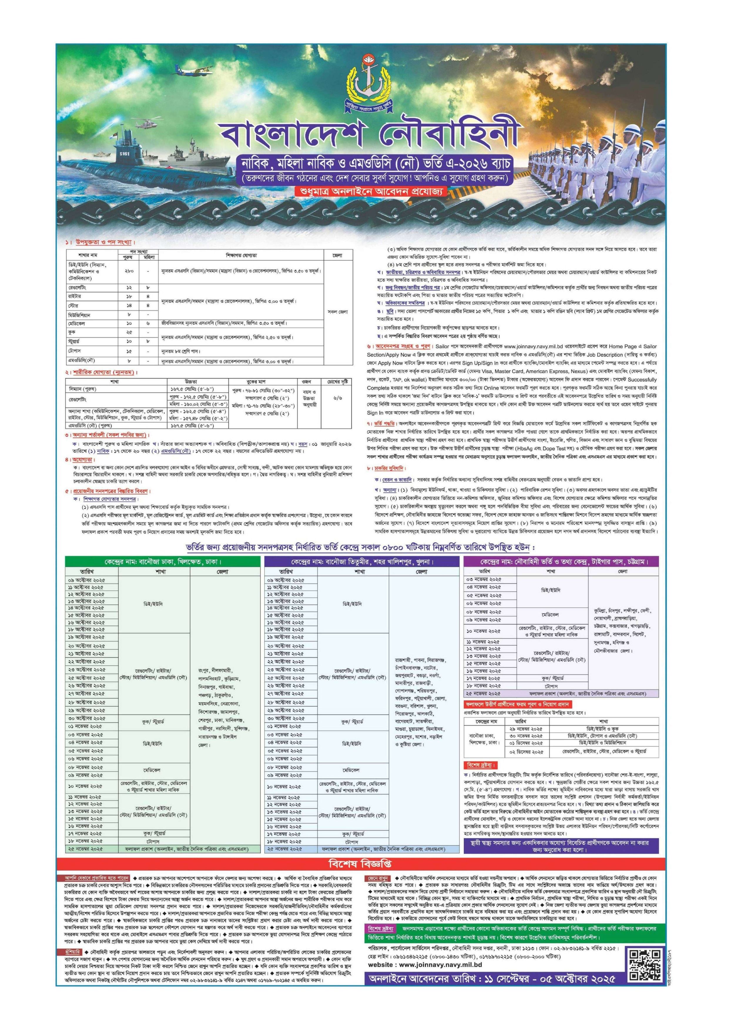 পদের নাম ও শাখা: বিজ্ঞপ্তি অনুযায়ী বিভিন্ন শাখার জন্য নাবিক ও এমওডিসি (নৌ) পদে প্রার্থী ভর্তি করা হবে। শাখাগুলোর মধ্যে রয়েছে সিম্যান, রেগুলেটিং, কমিউনিকেশন, টেকনিক্যাল, মেডিকেল, রাইটার, স্টোর, মিউজিশিয়ান, কুক, স্টুয়ার্ড এবং টোপাস।