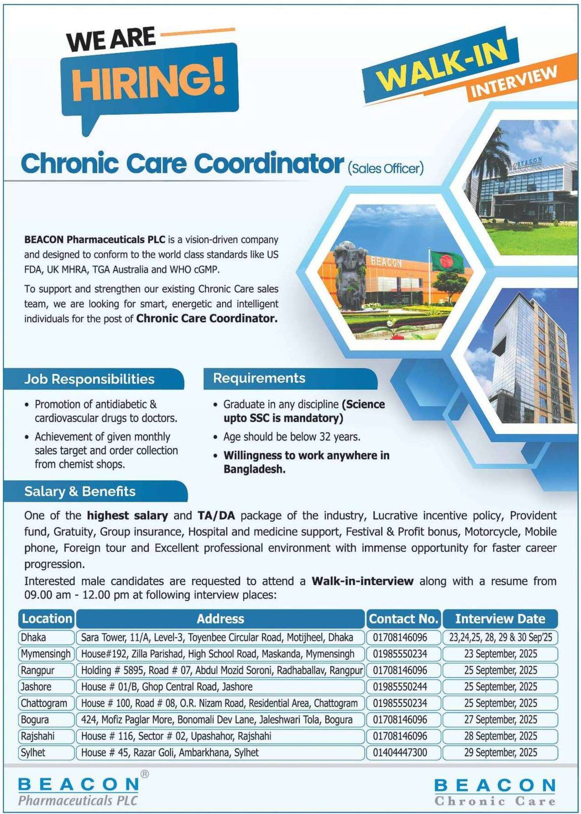 Beacon Pharmaceuticals PLC তাদের Chronic Care Coordinator (Sales Officer) পদের জন্য লোক নিয়োগ করছে। এই কাজের জন্য সরাসরি ওয়াক-ইন-ইন্টারভিউ নেওয়া হবে।