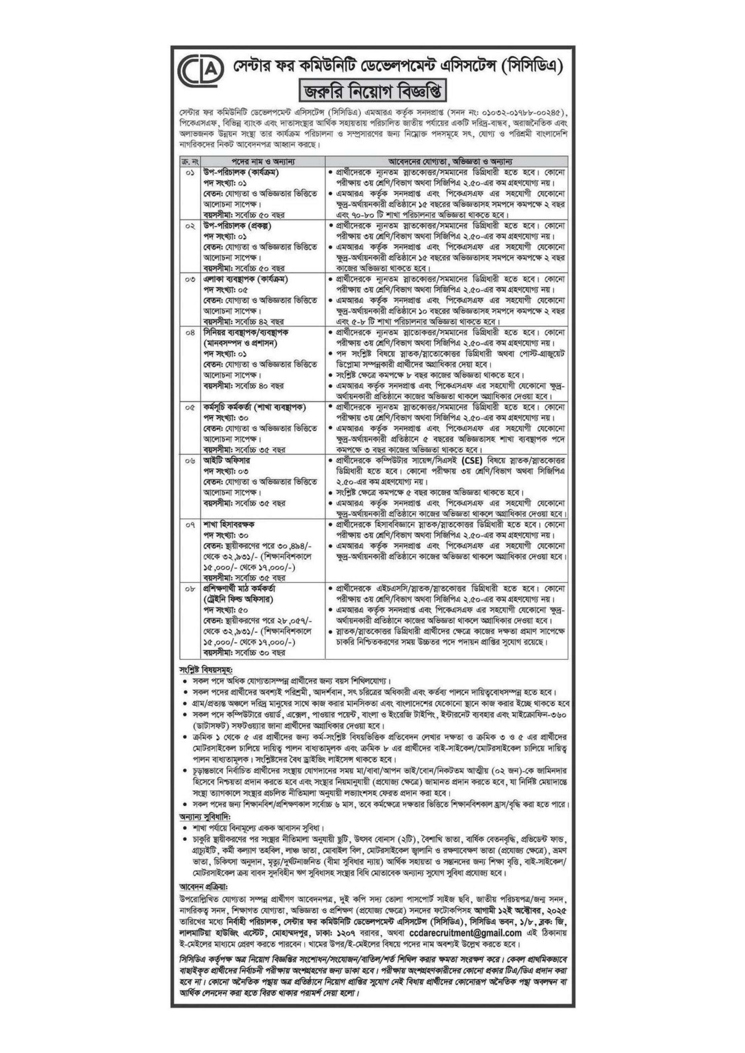 সেন্টার ফর কমিউনিটি ডেভেলপমেন্ট এসিসটেন্স (সিসিডিএ) এর নতুন নিয়োগ বিজ্ঞপ্তি প্রকাশ করেছে।