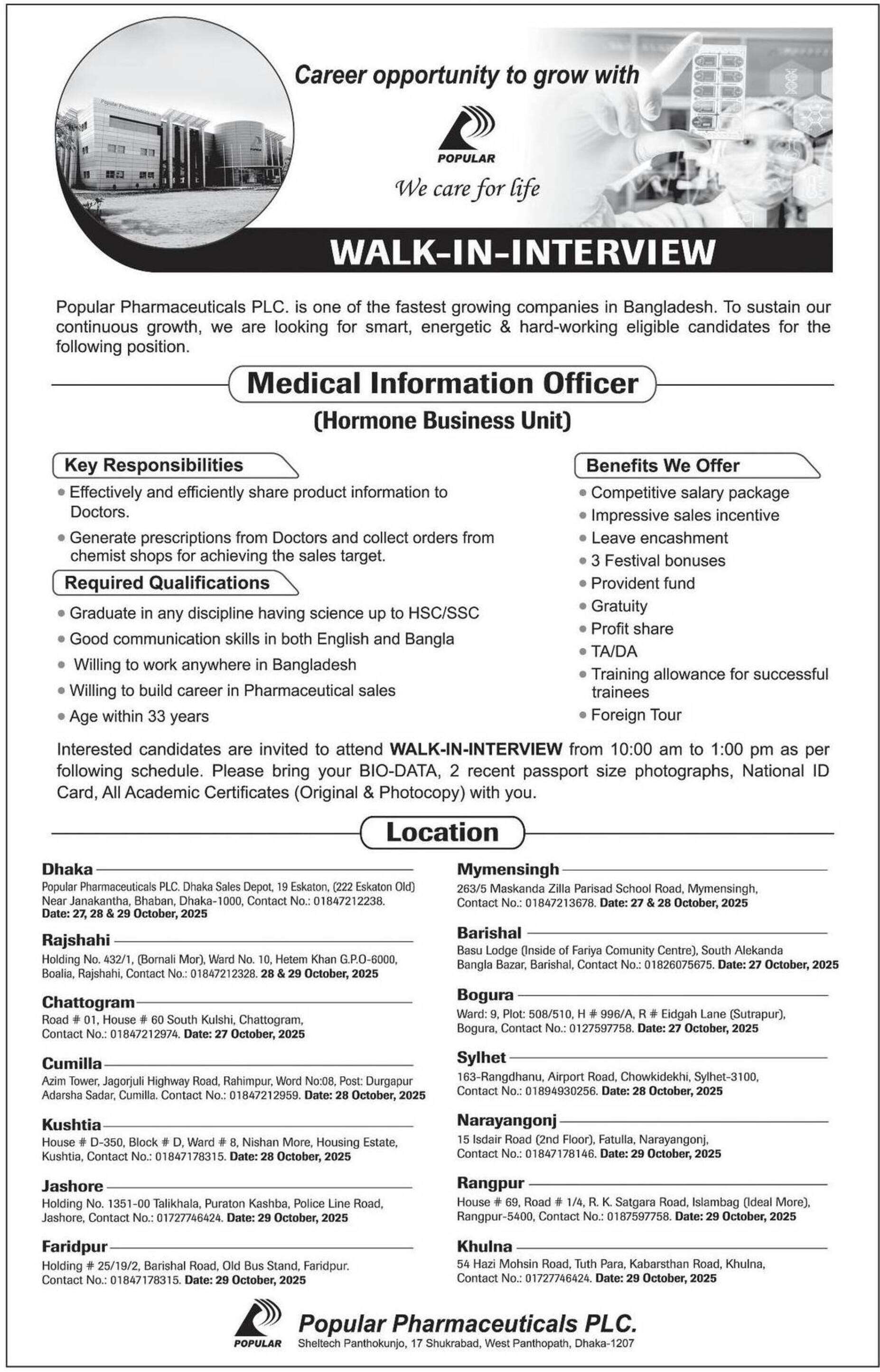 ওয়াক-ইন-ইন্টারভিউপপুলার ফার্মাসিউটিক্যালস পিএলসি. বাংলাদেশের সবচেয়ে দ্রুত বর্ধনশীল কোম্পানিগুলোর মধ্যে একটি। আমরা আমাদের বর্তমান অবস্থানের জন্য স্মার্ট, উদ্যমী ও কঠোর পরিশ্রমী যোগ্য প্রার্থীদের খুঁজছি।