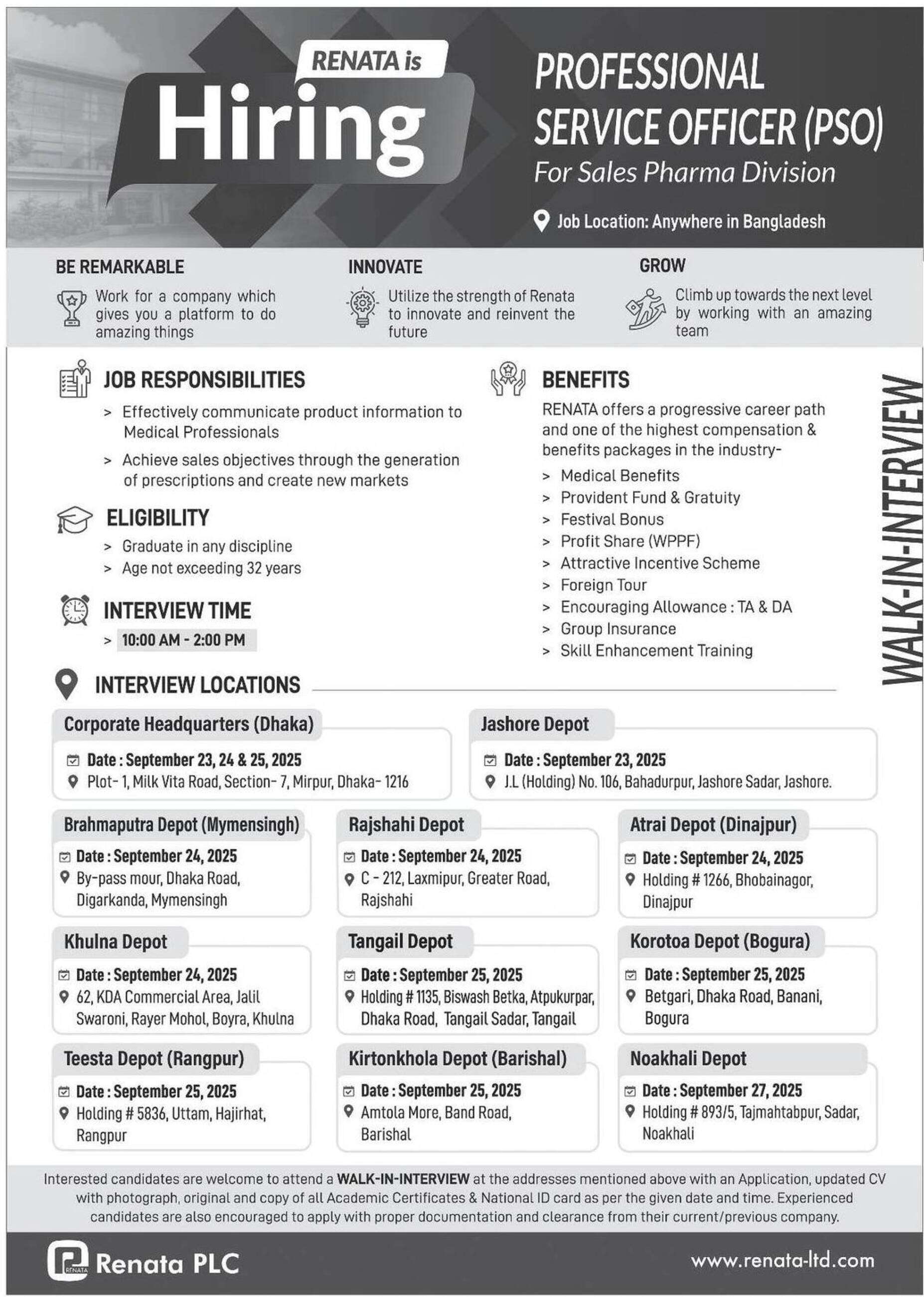 Renata PLC তাদের ফার্মাসিউটিক্যালস ডিভিশনের জন্য "প্রফেশনাল সার্ভিস অফিসার (PSO)" পদে লোক নিয়োগ করছে।