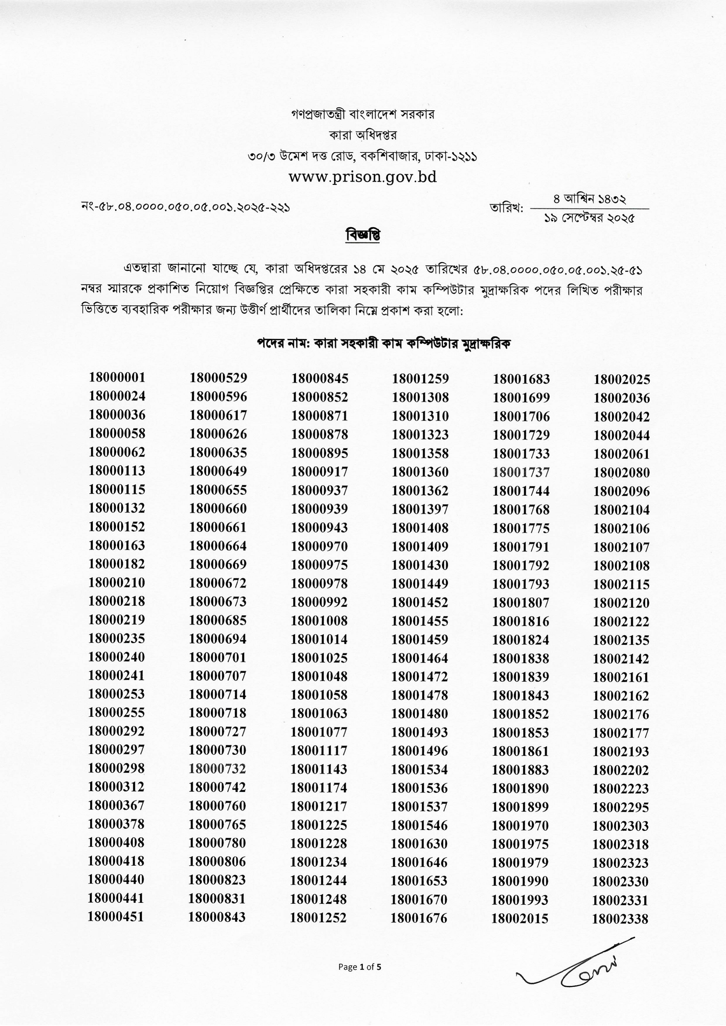 কারা অধিদপ্তরের ১৪ মে ২০২৫ তারিখের নিয়োগ বিজ্ঞপ্তির প্রেক্ষিতে কারা সহকারী কাম কম্পিউটার মুদ্রাক্ষরিক পদের লিখিত পরীক্ষায় উত্তীর্ণ প্রার্থীদের তালিকা প্রকাশ করা হয়েছে। মোট ১০৪৭ জন প্রার্থী ব্যবহারিক পরীক্ষার জন্য নির্বাচিত হয়েছেন।