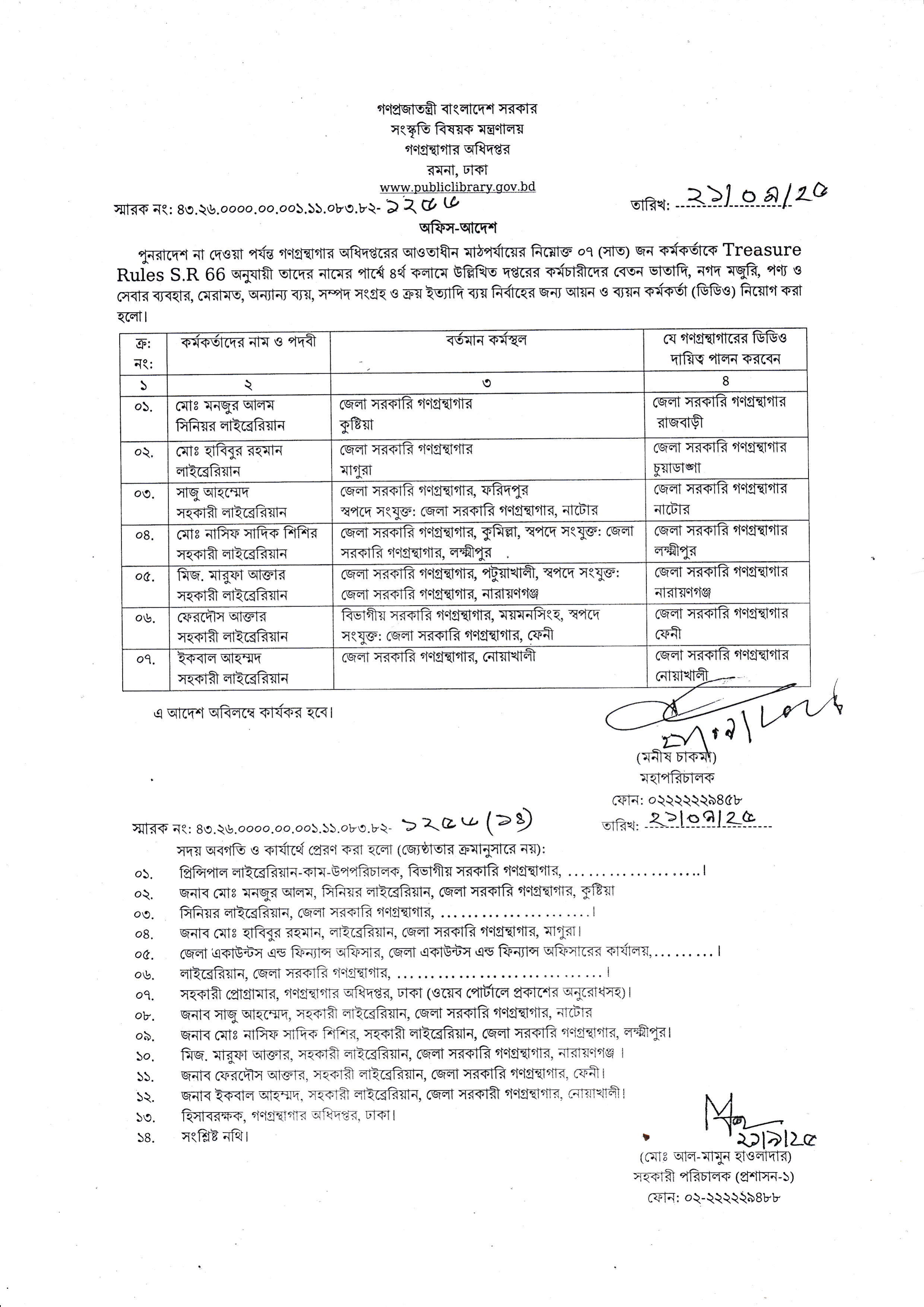 গণপ্রন্থাগার অধিদপ্তর কর্তৃক প্রকাশিত এক অফিস আদেশ অনুযায়ী, অধিদপ্তরের আওতাধীন মাঠপর্যায়ের মোট ০৭ (সাত) জন কর্মকর্তাকে নতুন আয়ন ও ব্যয়ন কর্মকর্তা (ডিডিও) হিসেবে নিয়োগ দেওয়া হয়েছে।