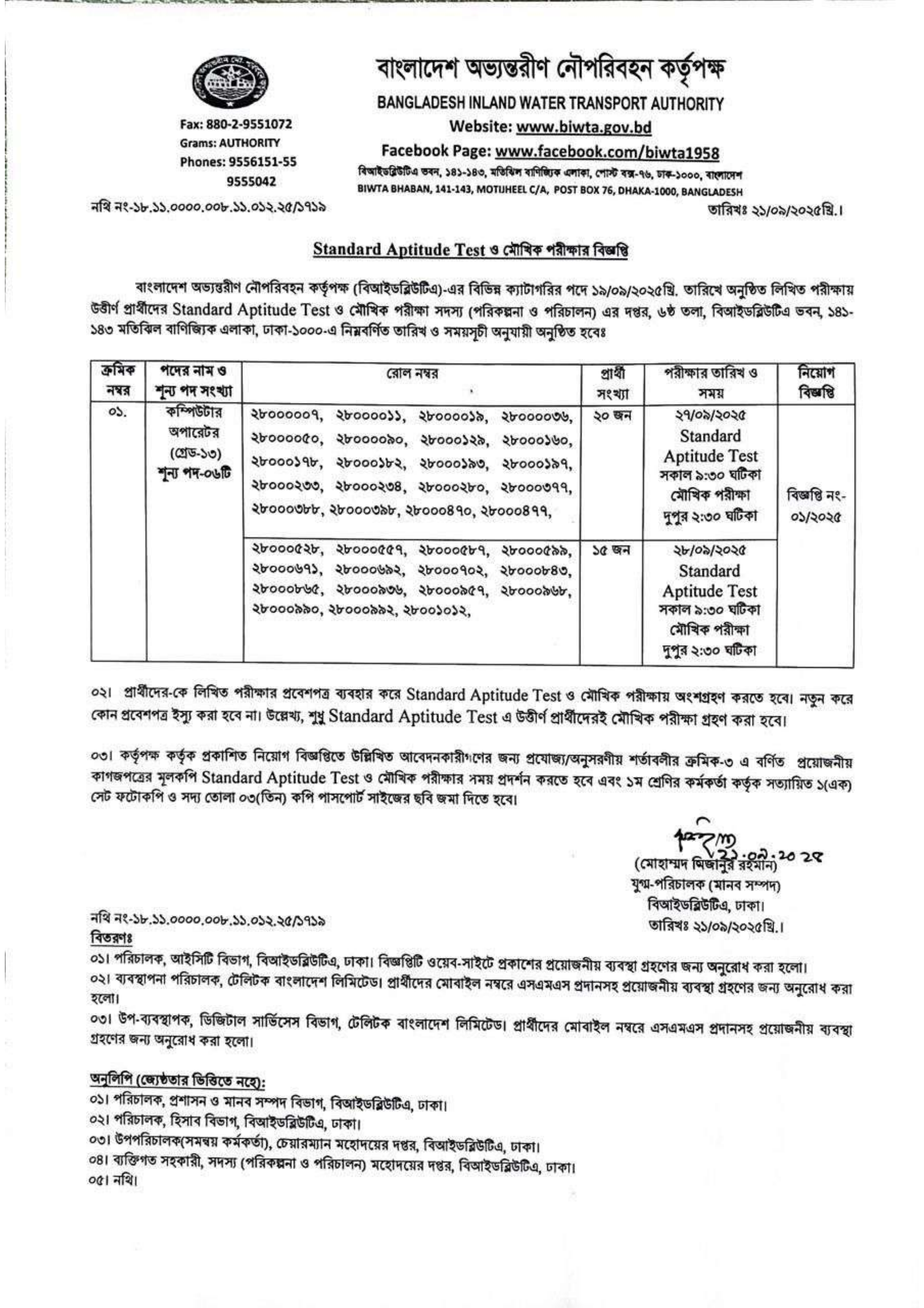 বাংলাদেশ অভ্যন্তরীণ নৌপরিবহন কর্তৃপক্ষ (বিআইডব্লিউটিএ) কর্তৃক ১৯/০৯/২০২৫ তারিখে অনুষ্ঠিত লিখিত পরীক্ষায় উত্তীর্ণ বিভিন্ন ক্যাটাগরির পদের প্রার্থীদের ব্যবহারিক (Skill) ও মৌখিক পরীক্ষার সময়সূচী প্রকাশ করা হয়েছে।
