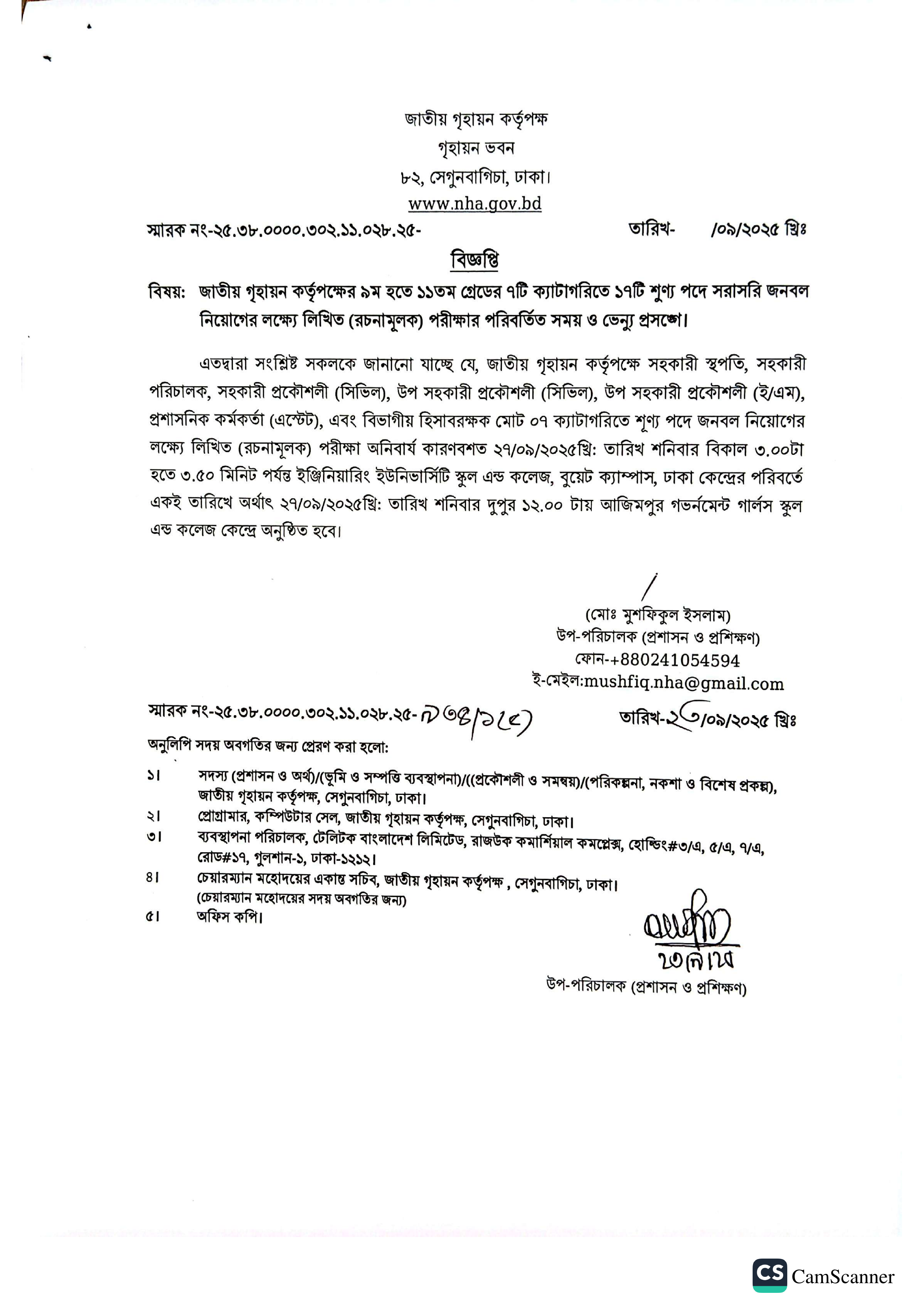 জাতীয় গৃহায়ন কর্তৃপক্ষের ৯ম থেকে ১১তম গ্রেডের ৭টি ক্যাটাগরিতে মোট ১৭টি শূন্য পদের লিখিত (রচনামূলক) পরীক্ষার সময়সূচি ও কেন্দ্র পরিবর্তন করা হয়েছে।