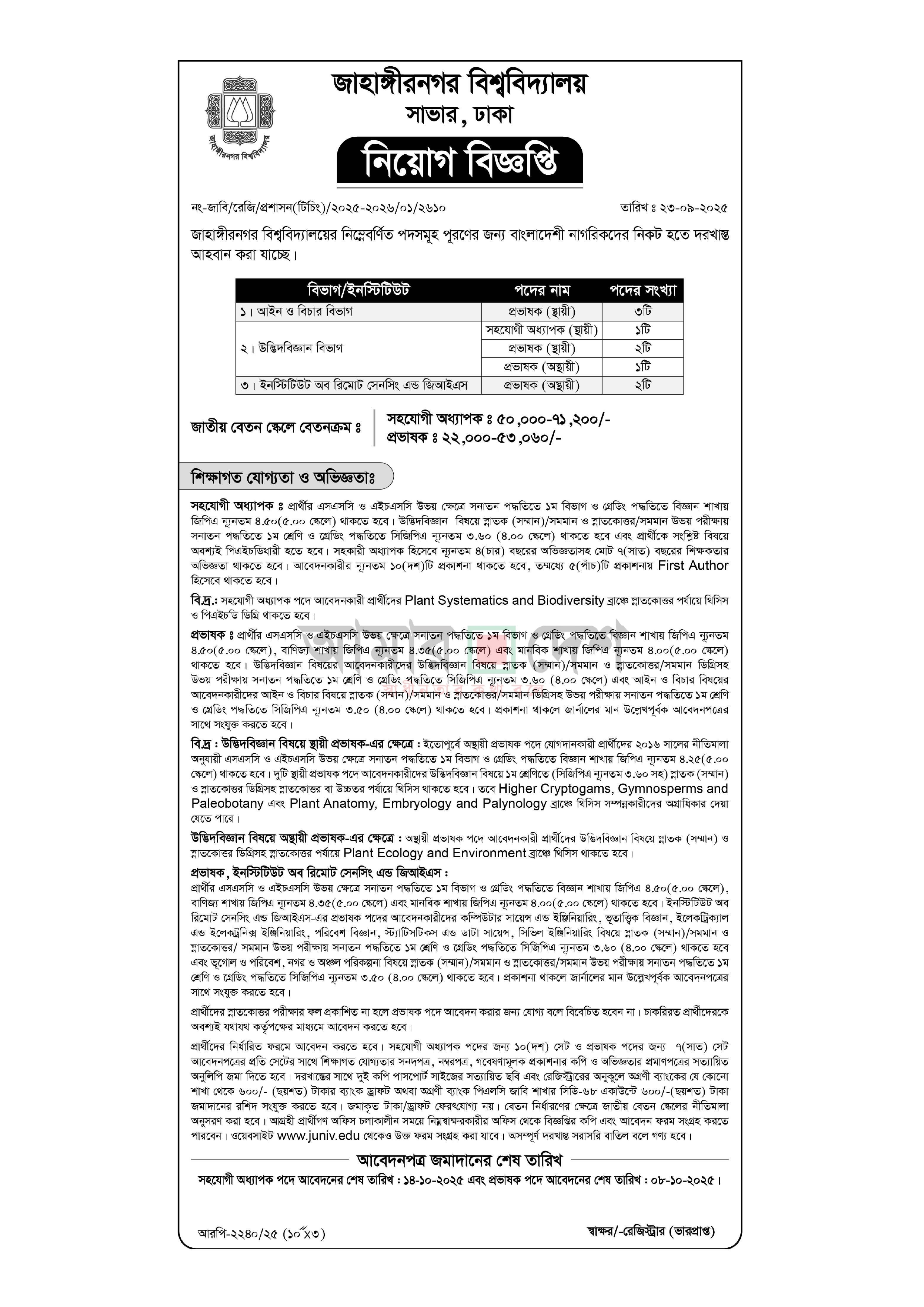 জাহাঙ্গীরনগর বিশ্ববিদ্যালয় কর্তৃক নতুন নিয়োগ বিজ্ঞপ্তি প্রকাশিত হয়েছে। এই বিজ্ঞপ্তিতে মোট ৯টি পদে জনবল নিয়োগ দেওয়া হবে। আগ্রহী যোগ্যতাসম্পন্ন প্রার্থীরা আবেদন করতে পারবেন।