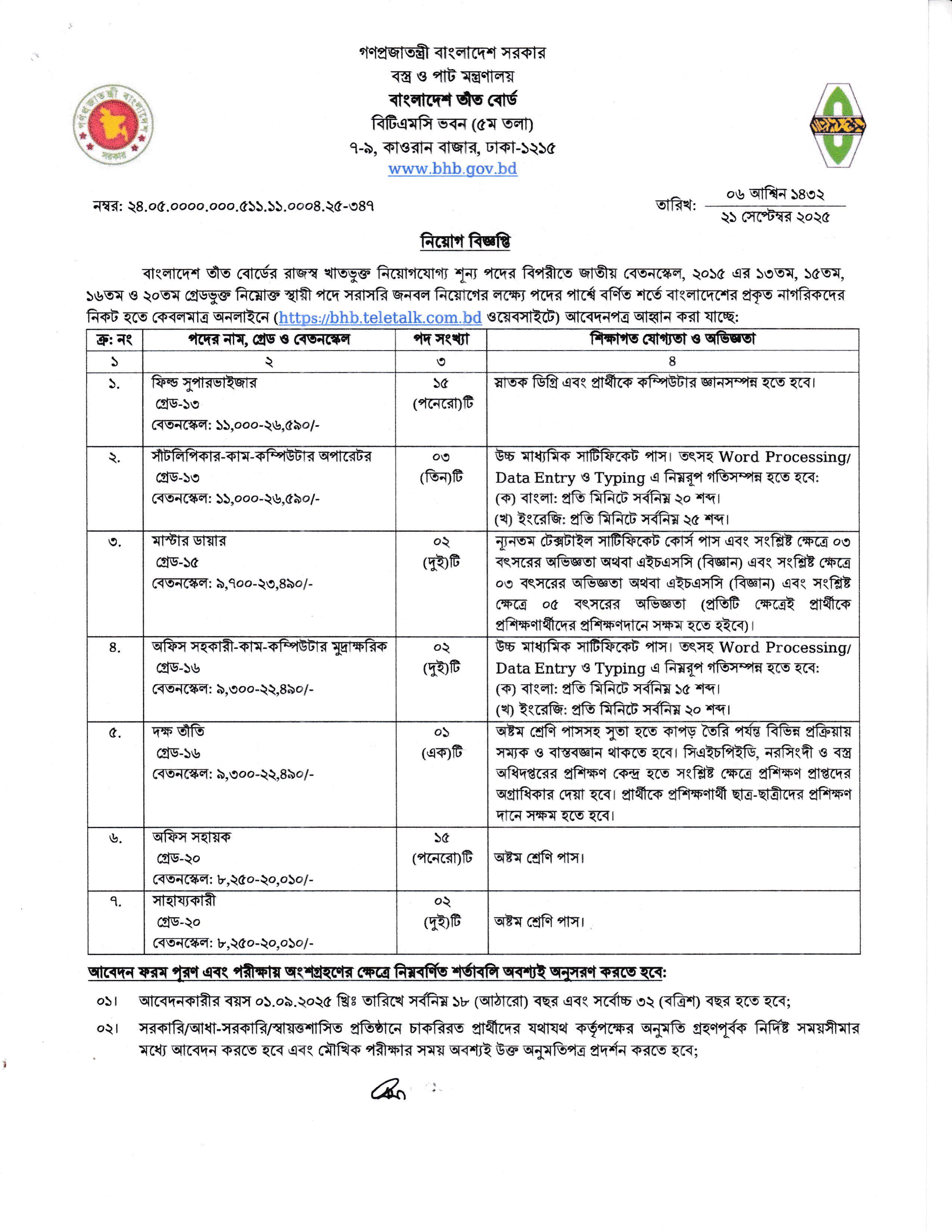 একনজরে বাংলাদেশ তাঁত বোর্ড নিয়োগ বিজ্ঞপ্তি ২০২৫