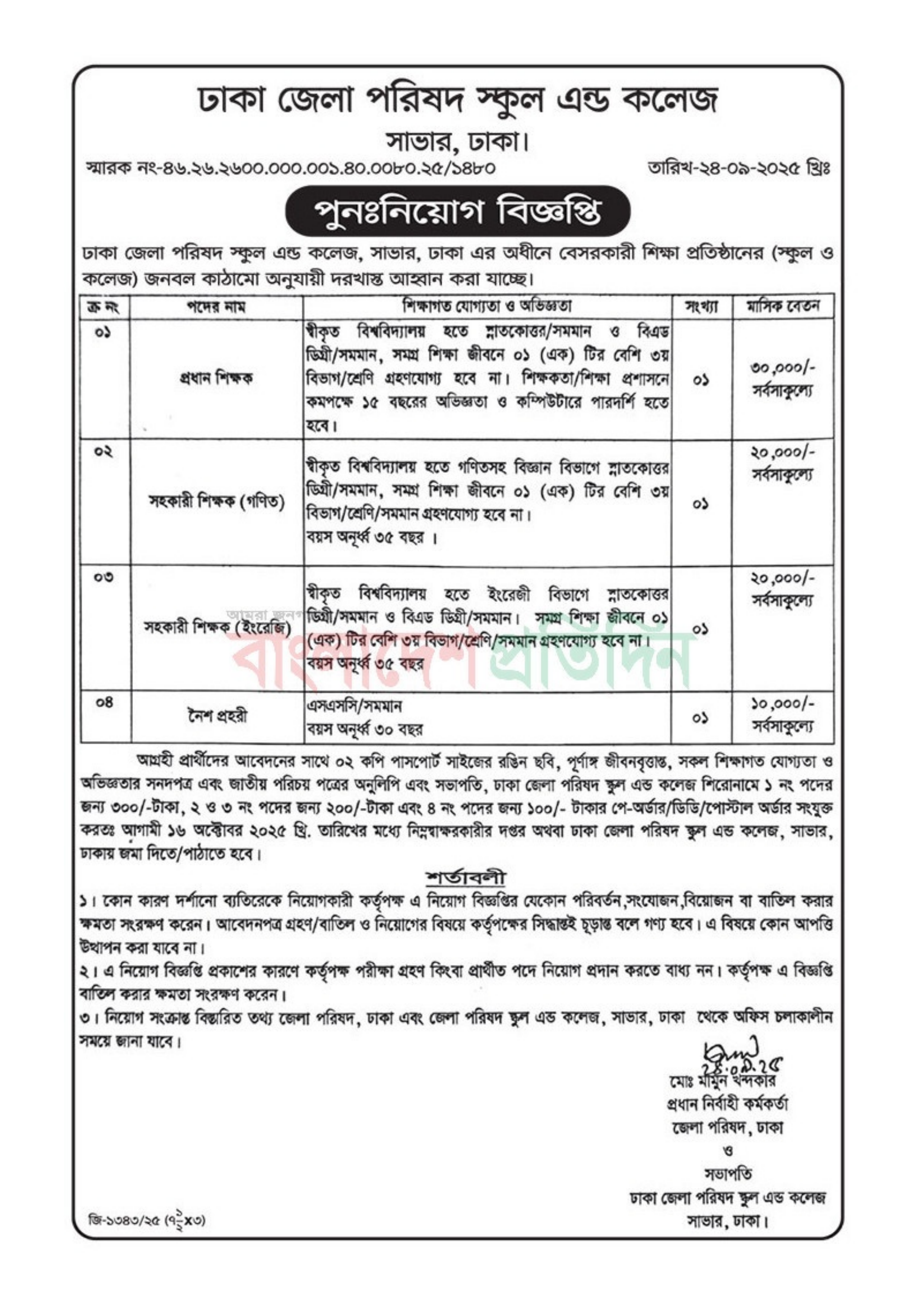 আবেদনের প্রক্রিয়া: আগ্রহী প্রার্থীদের আবেদনের সাথে ০২ কপি পাসপোর্ট সাইজের রঙিন ছবি, পূর্ণাঙ্গ জীবনবৃত্তান্ত, সকল শিক্ষাগত যোগ্যতা ও অভিজ্ঞতার সনদপত্র এবং জাতীয় পরিচয় পত্রের অনুলিপি জমা দিতে হবে। এছাড়া, 'সভাপতি, ঢাকা জেলা পরিষদ স্কুল এন্ড কলেজ' শিরোনামে পে-অর্ডার/ডিডি/পোস্টাল অর্ডার সংযুক্ত করতে হবে। আবেদন ফি পদের ক্যাটাগরি অনুযায়ী ভিন্ন (১ নং পদের জন্য ৩০০/- টাকা, ২ ও ৩ নং পদের জন্য ২০০/- টাকা এবং ৪ নং পদের জন্য ১০০/- টাকা)। আবেদনপত্র নিম্নস্বাক্ষরকারীর দপ্তর অথবা ঢাকা জেলা পরিষদ স্কুল এন্ড কলেজ, সাভার, ঢাকায় জমা দিতে/পাঠাতে হবে।