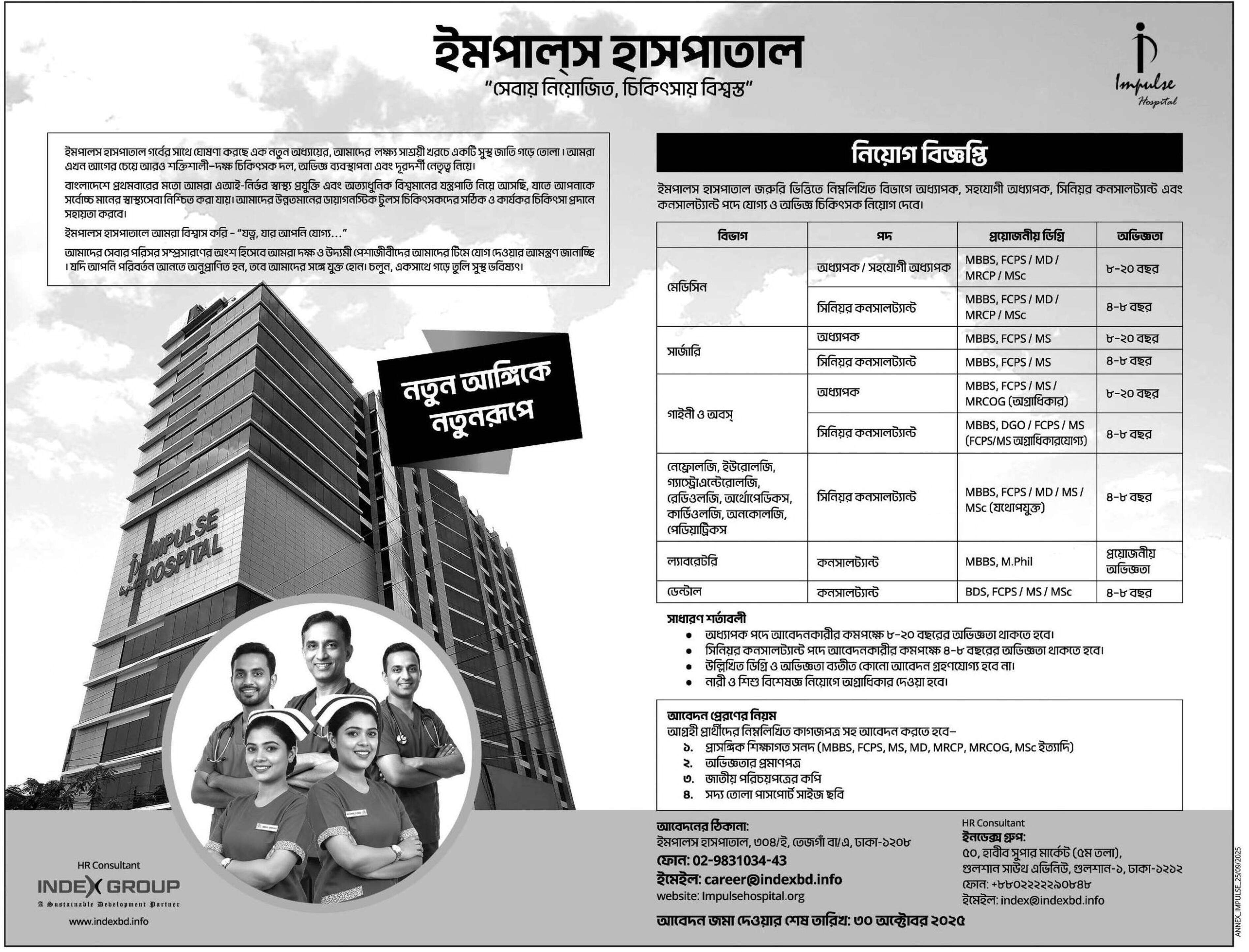 ইমপালস হাসপাতাল একটি আধুনিক ও বিশেষায়িত চিকিৎসার প্রতিষ্ঠান। প্রতিষ্ঠানটি বিশেষজ্ঞ, সিনিয়র কনসালট্যান্ট, কনসালট্যান্ট ও অন্যান্য পদের জন্য নিম্নলিখিত নিয়োগ বিজ্ঞপ্তি প্রকাশ করেছে।