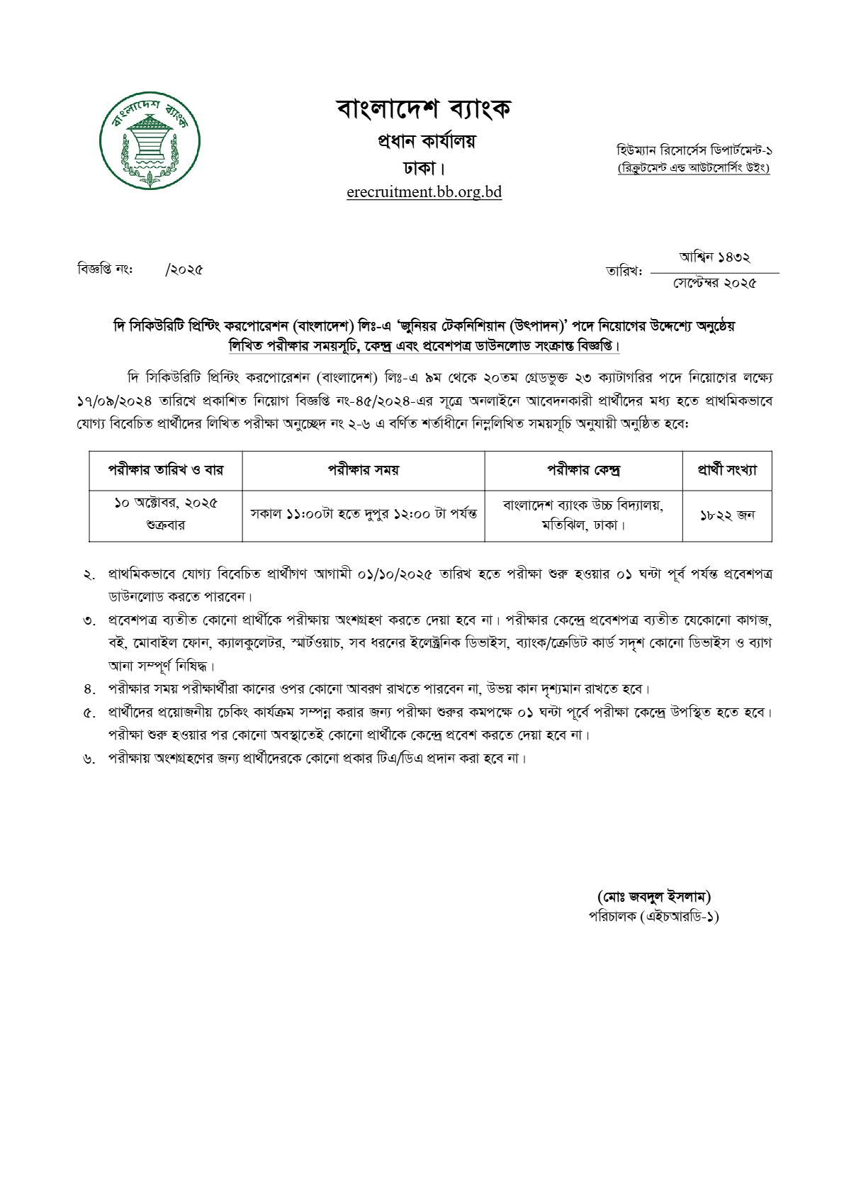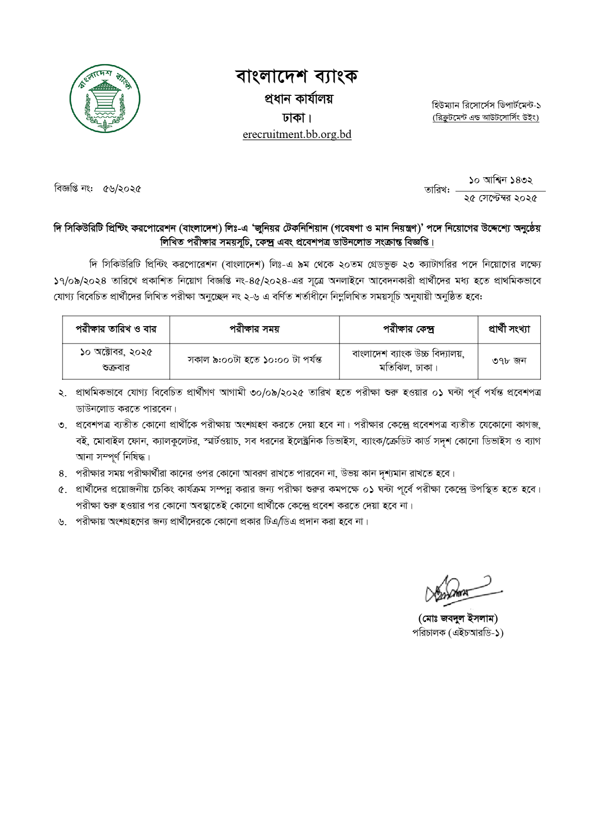 বাংলাদেশ ব্যাংক কর্তৃক দি সিকিউরিটি প্রিন্টিং করপোরেশন (বাংলাদেশ) লিঃ এর “জুনিয়র টেকনিশিয়ান (উৎপাদন) জুনিয়র টেকনিশিয়ান (গবেষনা ও মান নিয়ন্ত্রণ)” পদে নিয়োগের লক্ষ্যে অনুষ্ঠেয় লিখিত পরীক্ষার সময়সূচি ও প্রবেশপত্র ডাউনলোড সংক্রান্ত বিজ্ঞপ্তি প্রকাশ করা হয়েছে।