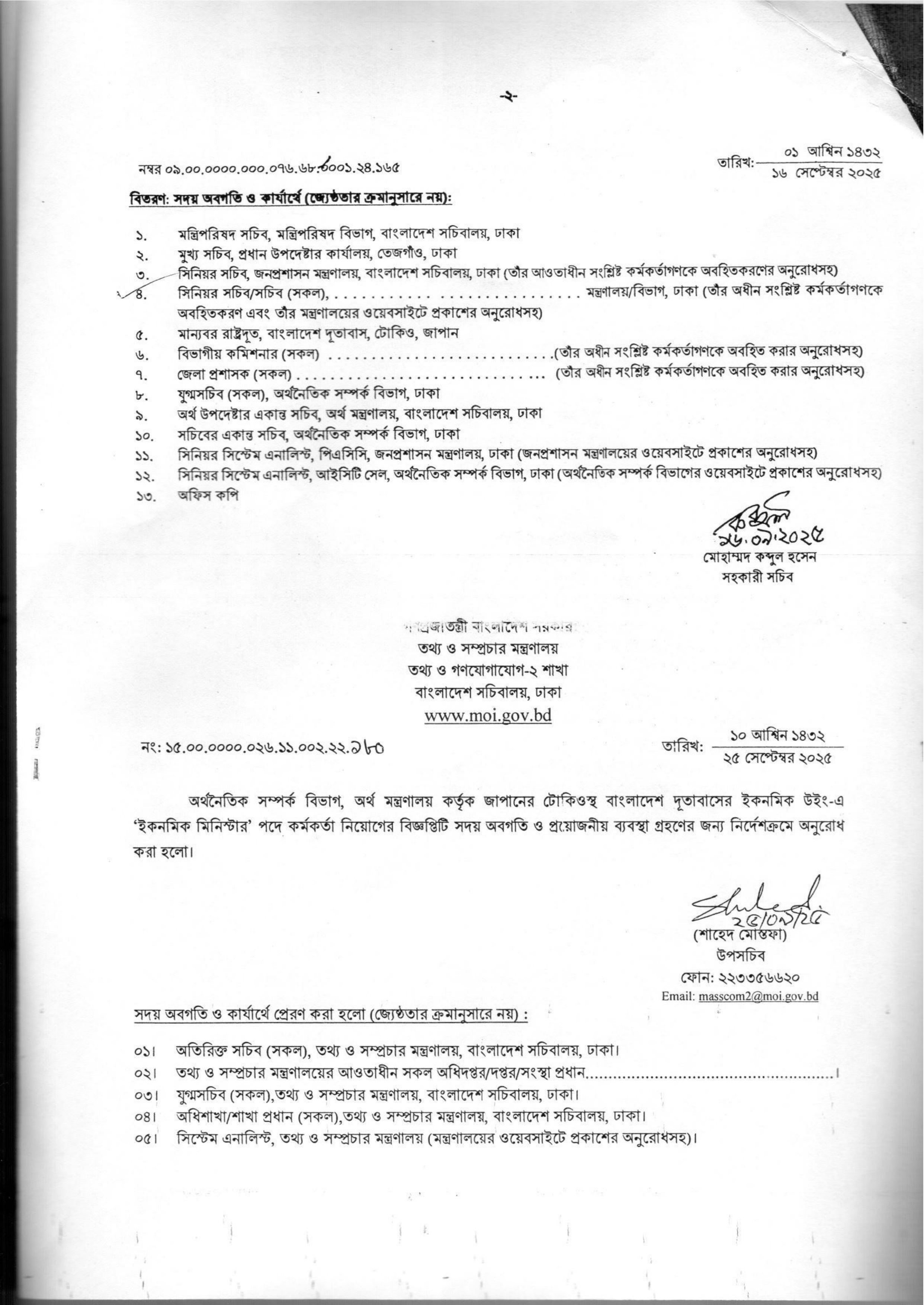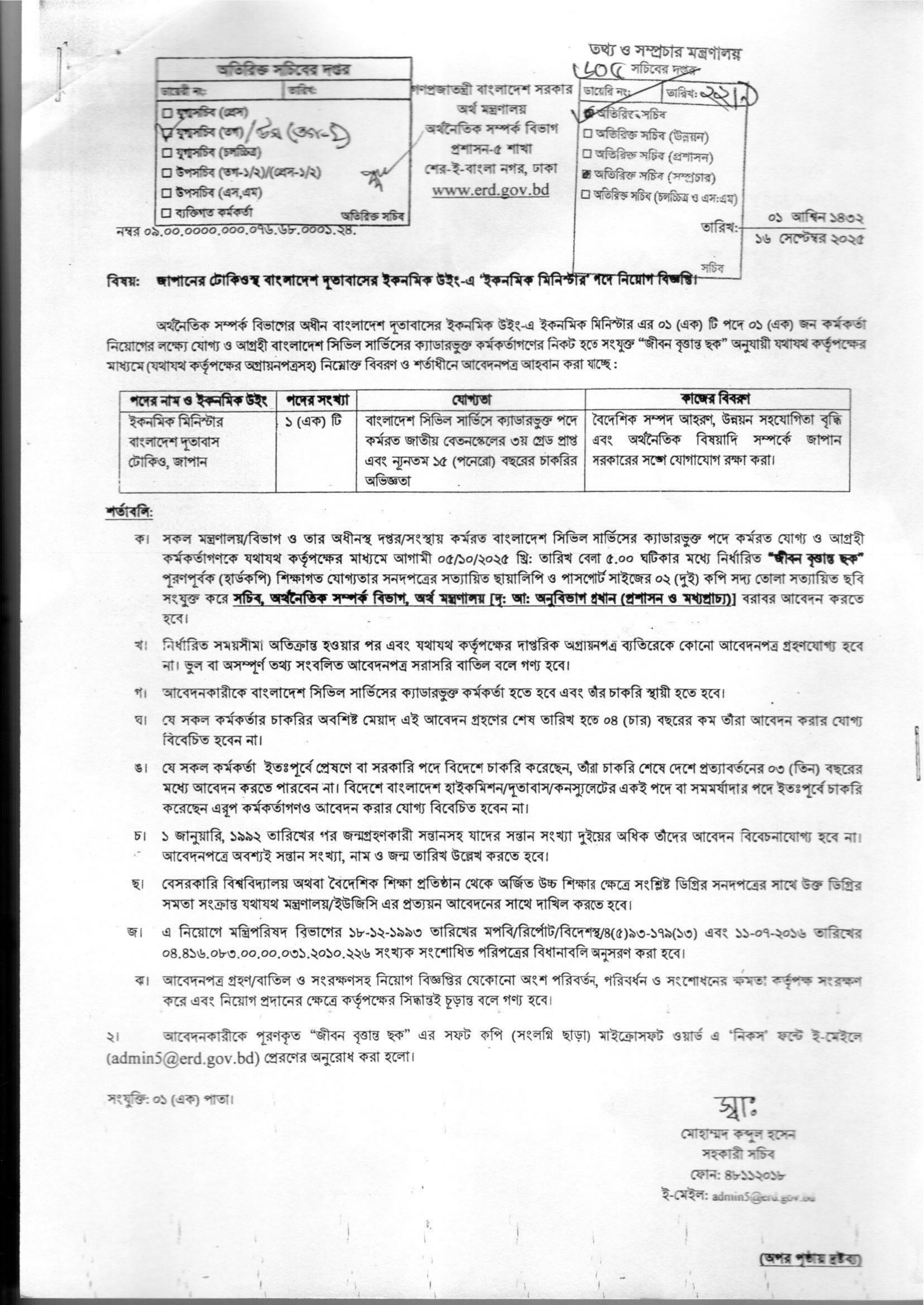 পদের নাম ও সংখ্যা: ইকনমিক মিনিস্টার (০১টি)