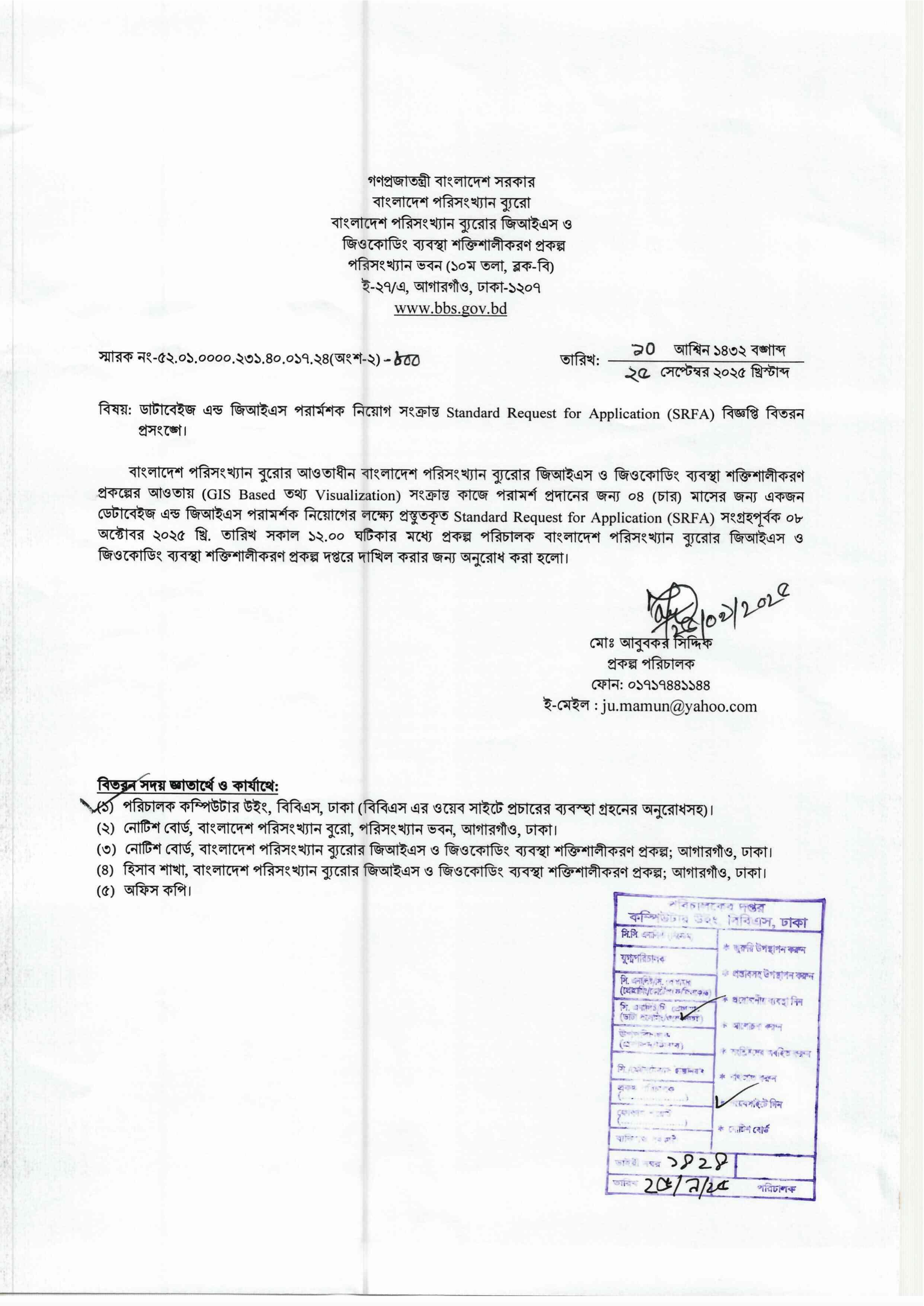 বাংলাদেশ পরিসংখ্যান ব্যুরো (BBS) এর জিআইএস ও জিওকোডিং ব্যবস্থা শক্তিশালীকরণ প্রকল্পে একজন ডেটাবেইজ এন্ড জিআইএস পরামর্শক নিয়োগের জন্য বিজ্ঞপ্তি প্রকাশিত হয়েছে।