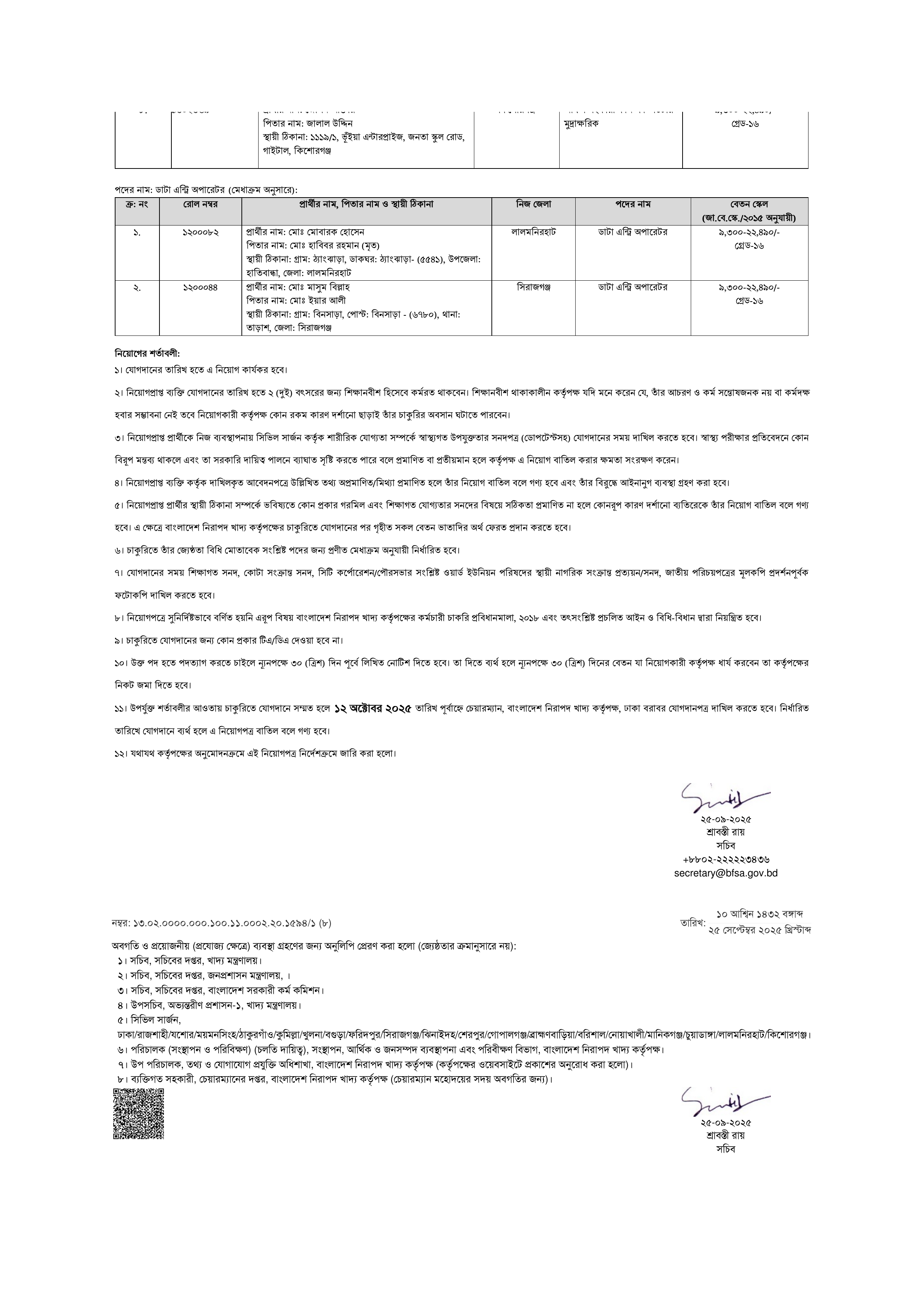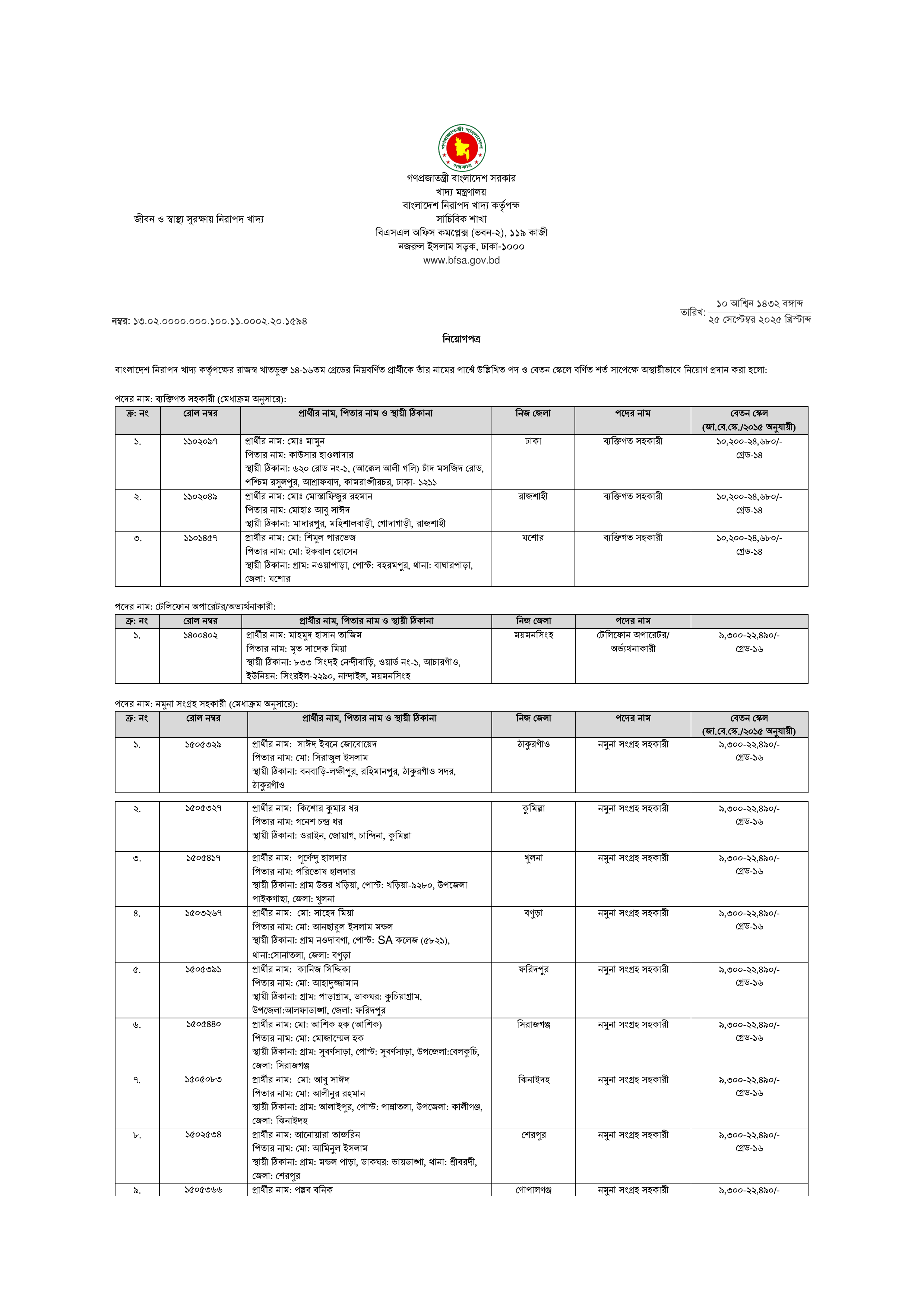 বাংলাদেশ নিরাপদ খাদ্য কর্তৃপক্ষ (BFSA) এর শূন্য পদসমূহে বিভিন্ন পদের জন্য নির্বাচিত প্রার্থীদের নিয়োগপত্র প্রকাশ করা হয়েছে। মোট ২৭ (সাতাশ) জন প্রার্থীকে অস্থায়ীভাবে নিয়োগ প্রদান করা হয়েছে।