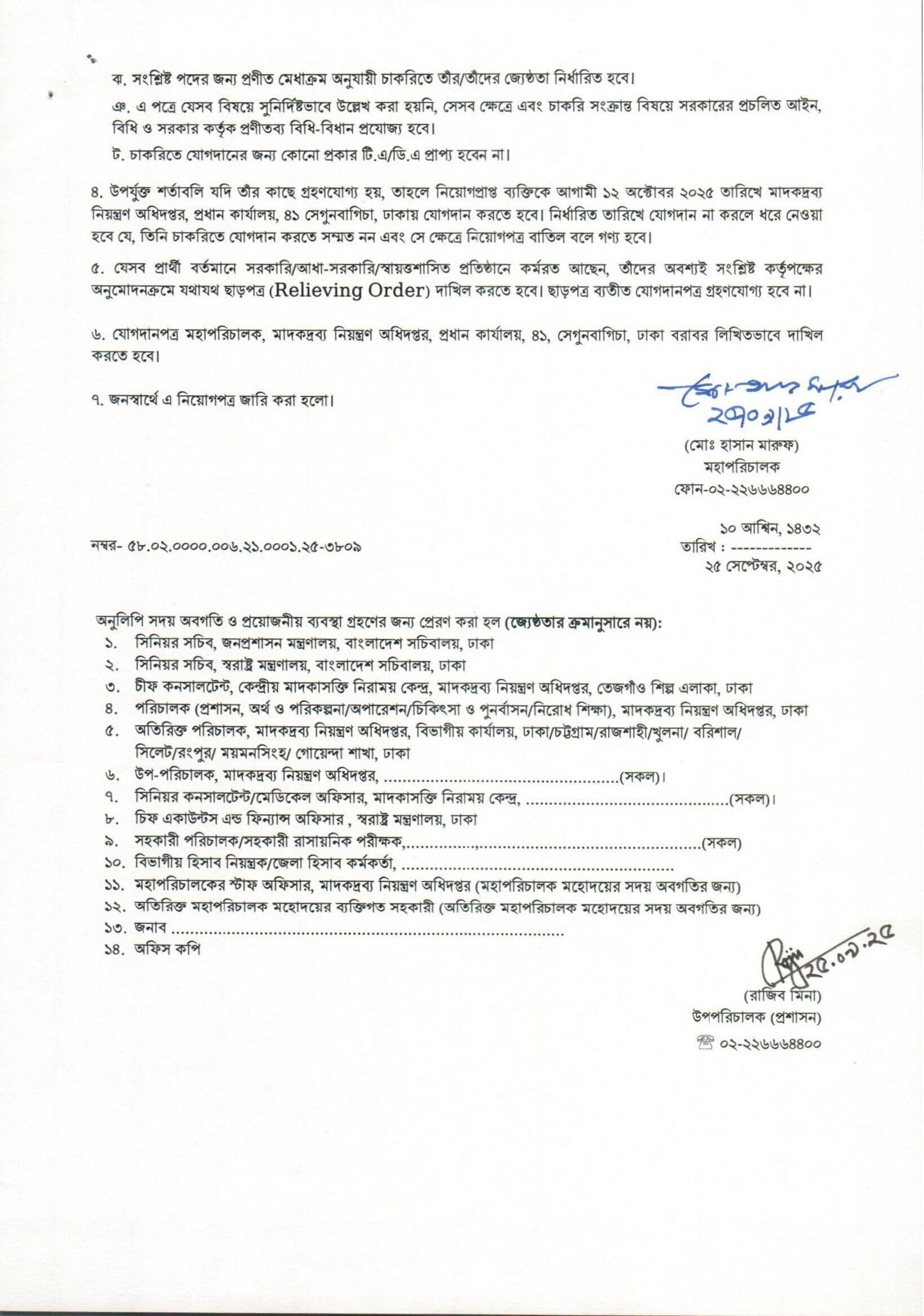 যোগদানের স্থান: মাদকদ্রব্য নিয়ন্ত্রণ অধিদপ্তর, প্রধান কার্যালয়, ৪১ সেগুনবাগিচা, ঢাকা।
