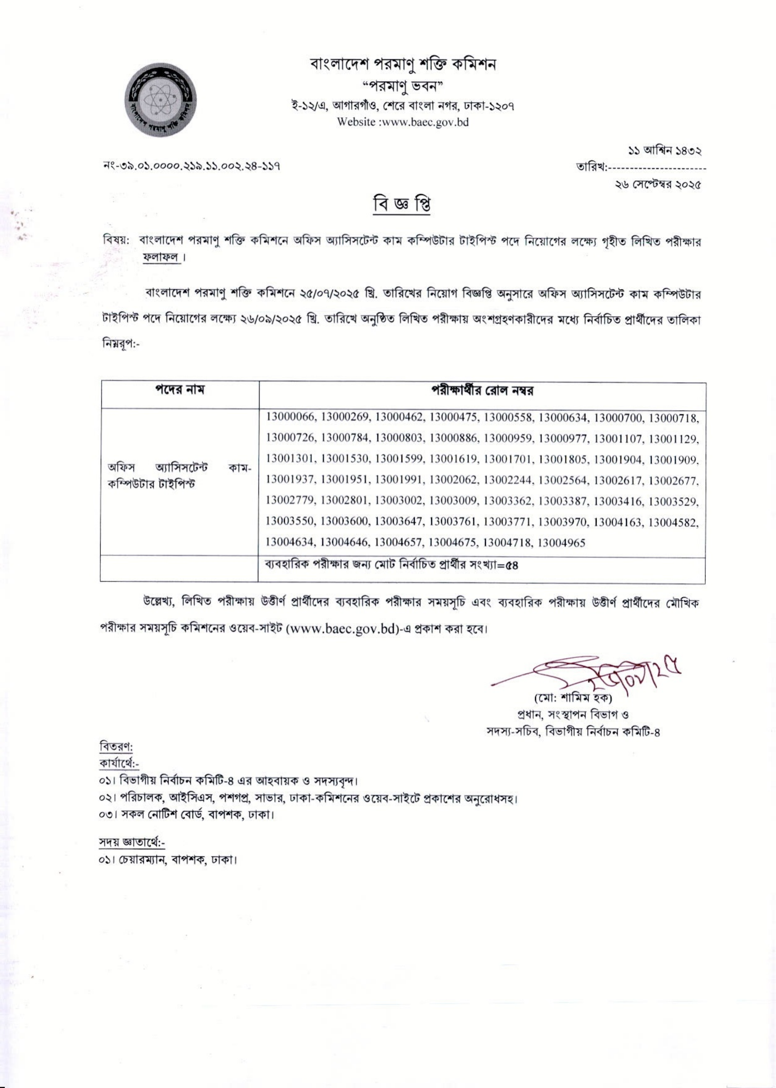 বাংলাদেশ পরমাণু শক্তি কমিশন (BAEC) কর্তৃক অফিস আ্যাসিসটেন্ট কাম কম্পিউটার টাইপিস্ট পদে নিয়োগের লক্ষ্যে অনুষ্ঠিত লিখিত পরীক্ষার ফলাফল প্রকাশ করা হয়েছে।