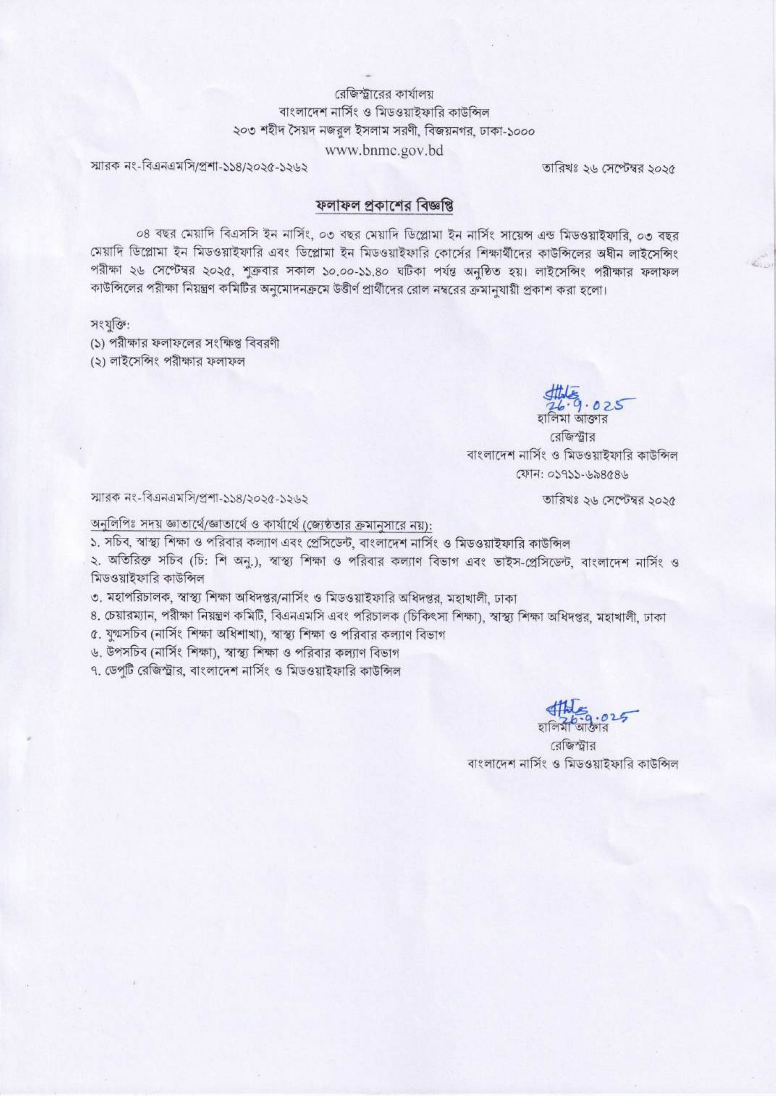 বাংলাদেশ নার্সিং ও মিডওয়াইফারি কাউন্সিলের অধীন ০৪ বছর মেয়াদী বিএসসি ইন নার্সিং, ০৩ বছর মেয়াদী ডিপ্লোমা ইন নার্সিং সায়েন্স এন্ড মিডওয়াইফারি, ০৩ বছর মেয়াদী ডিপ্লোমা ইন মিডওয়াইফারি এবং ডিপ্লোমা ইন পেশেন্ট কেয়ার টেকনোলজি কোর্সের লাইসেন্সিং পরীক্ষার ফলাফল প্রকাশিত হয়েছে।