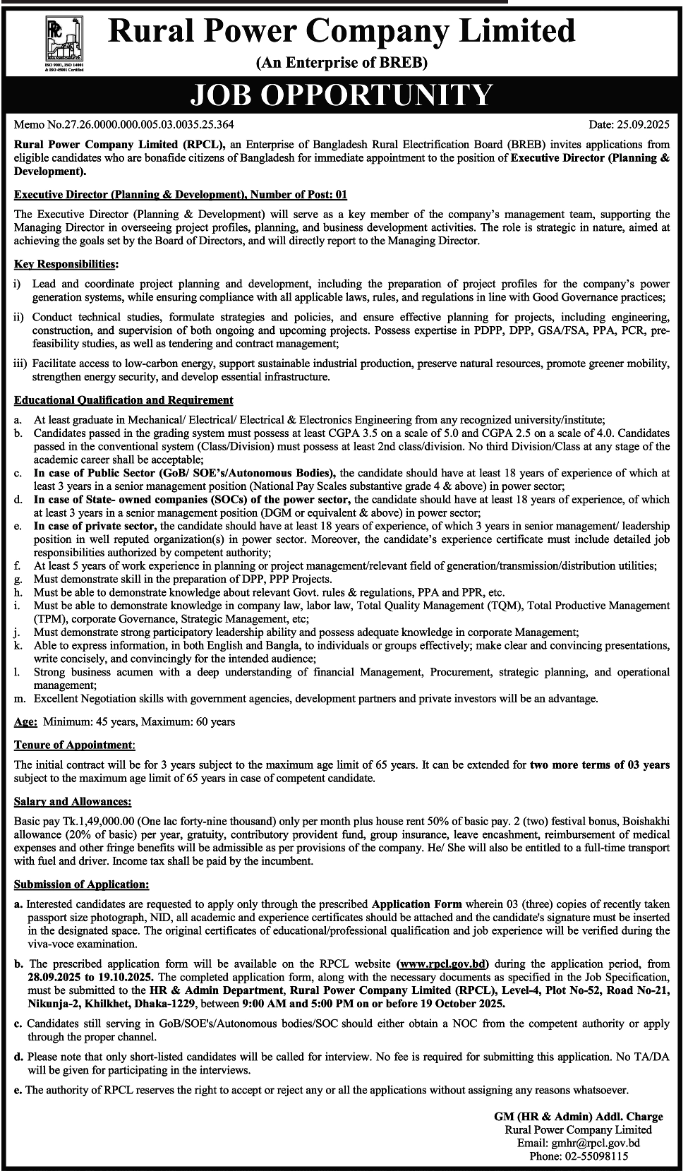 - ঠিকানা: জিএম (এইচআর ও অ্যাডমিন) অ্যাড. চার্জ, রুরাল পাওয়ার কোম্পানি লিমিটেড (আরপিএল), লেভেল-৪, প্লট নং-৫২, রোড নং-২১, নিকুঞ্জ-২, ঢাকা-১২২৯।