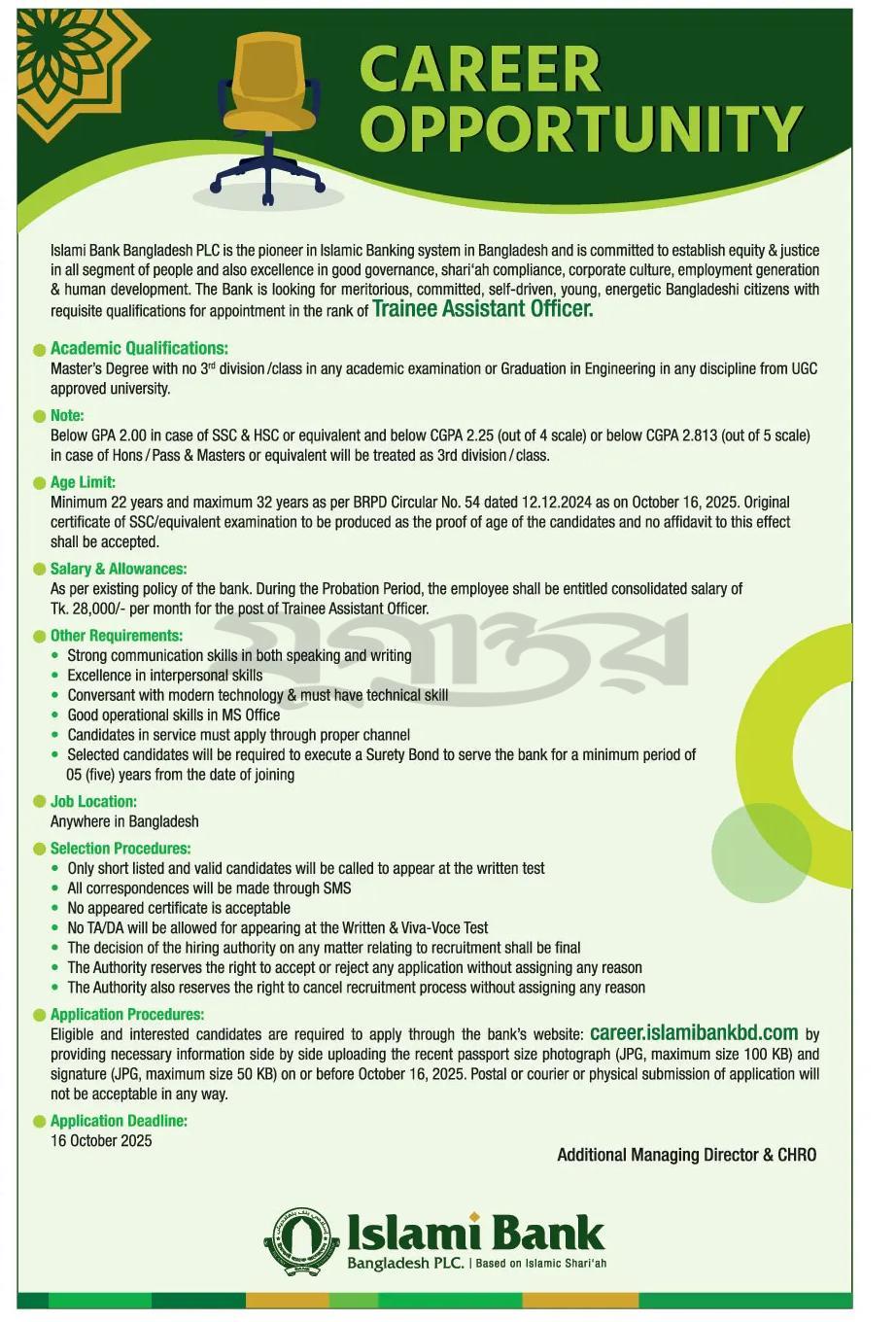 ইসলামী ব্যাংক বাংলাদেশ পিএলসি-এর ট্রেইনি অ্যাসিস্ট্যান্ট অফিসার পদের