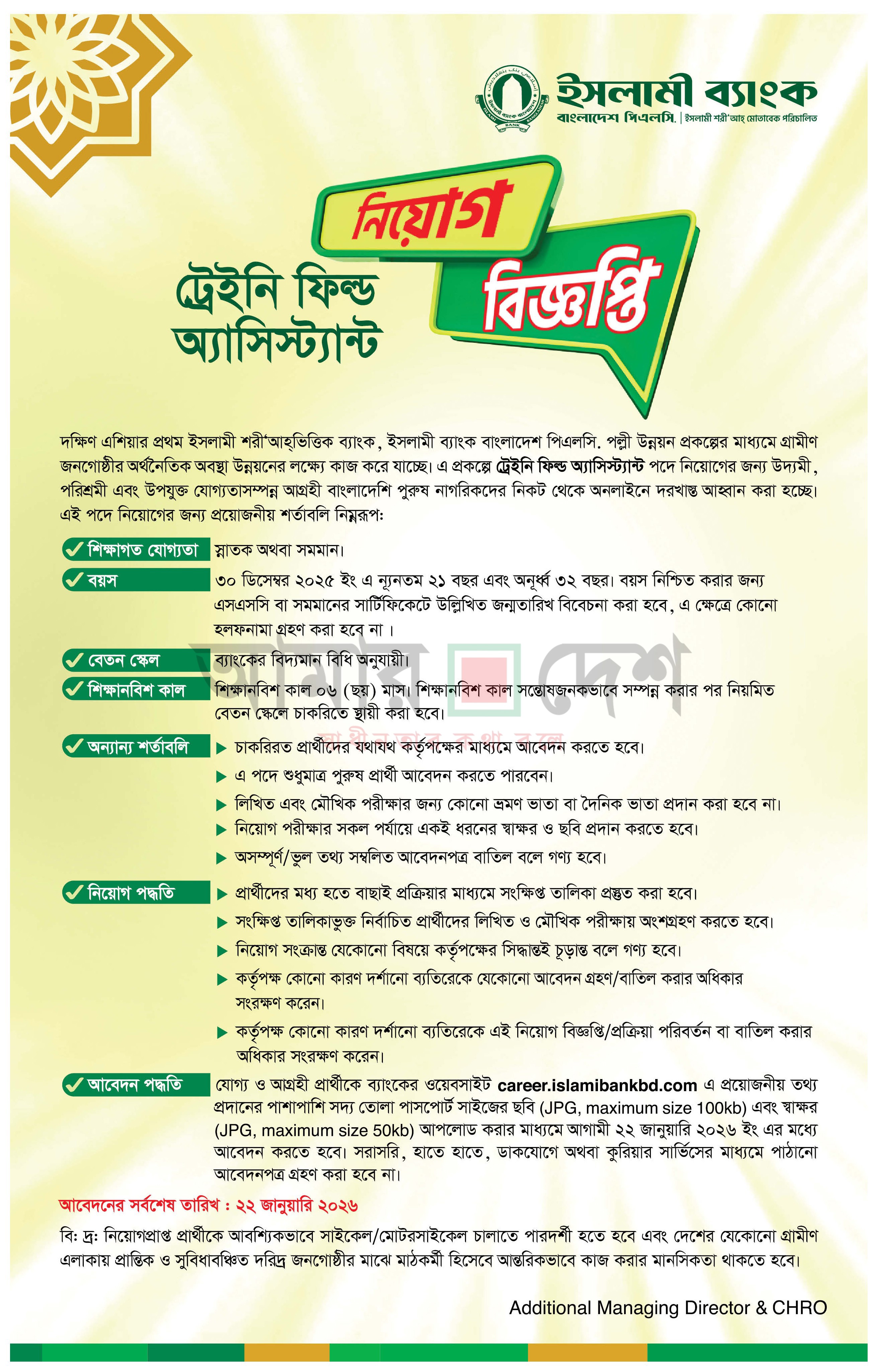 ইসলামী ব্যাংক বাংলাদেশ পিএলসি-এর ট্রেইনি ফিল্ড অ্যাসিস্ট্যান্ট পদে নিয়োগের জন্য আবেদনপত্র আহ্বান করা হচ্ছে।