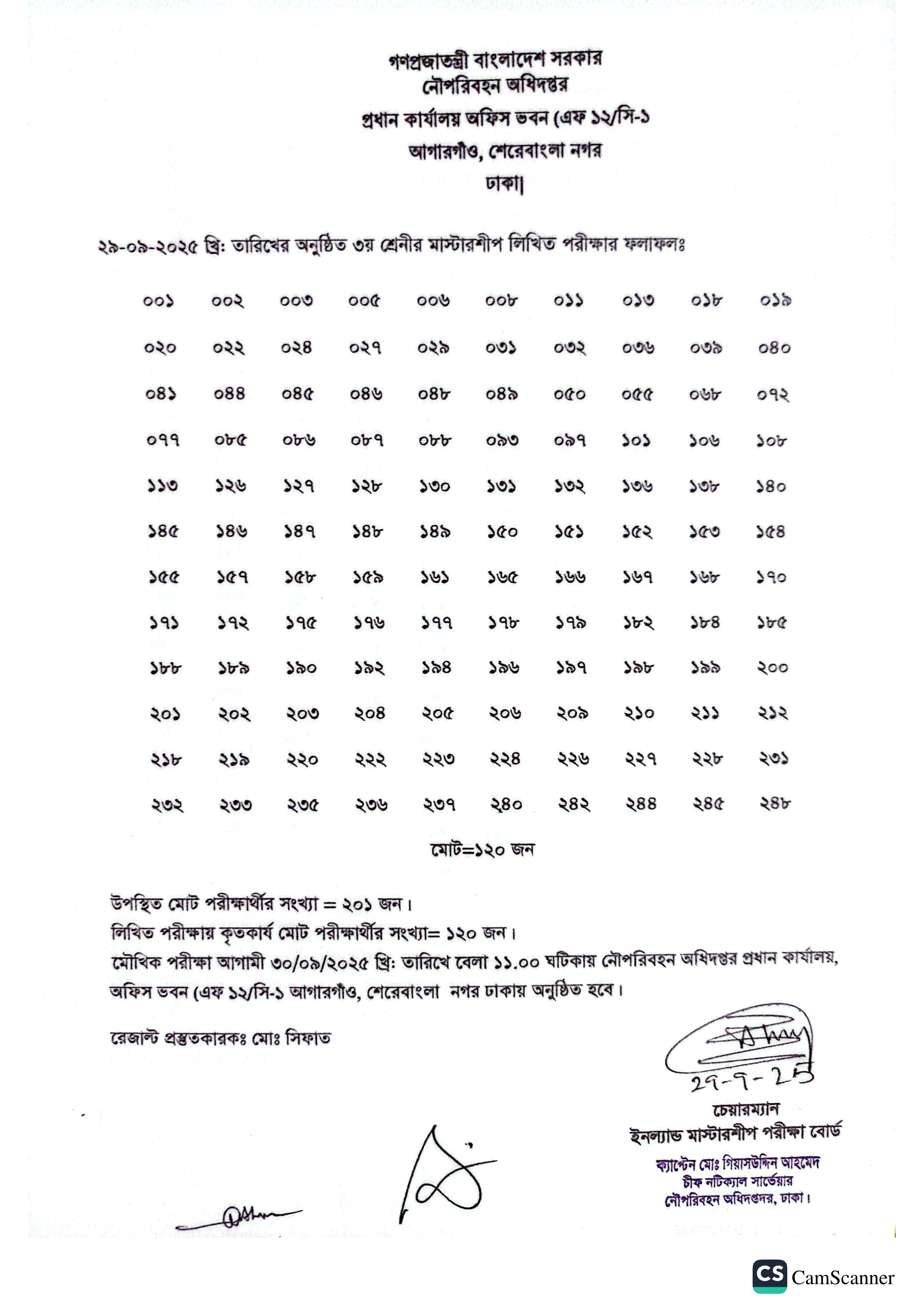 নৌপরিবহন অধিদপ্তর কর্তৃক গত ২৯-০৯-২০২৫ তারিখে অনুষ্ঠিত ৩য় শ্রেণীর মাস্টারশীপ লিখিত পরীক্ষার ফলাফল প্রকাশ করা হয়েছে।