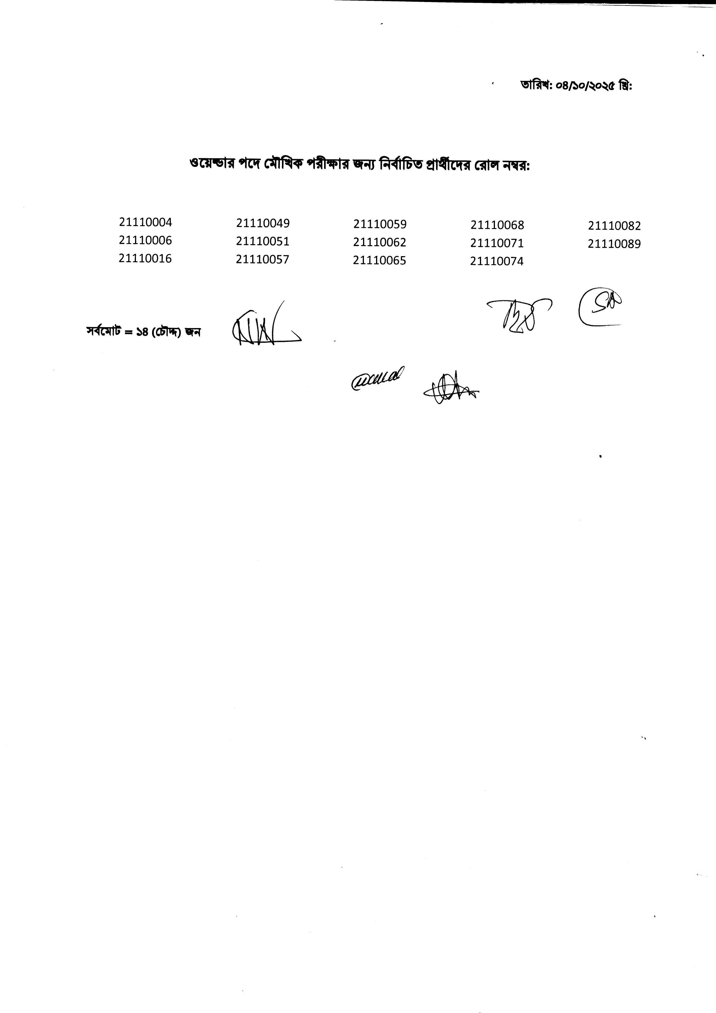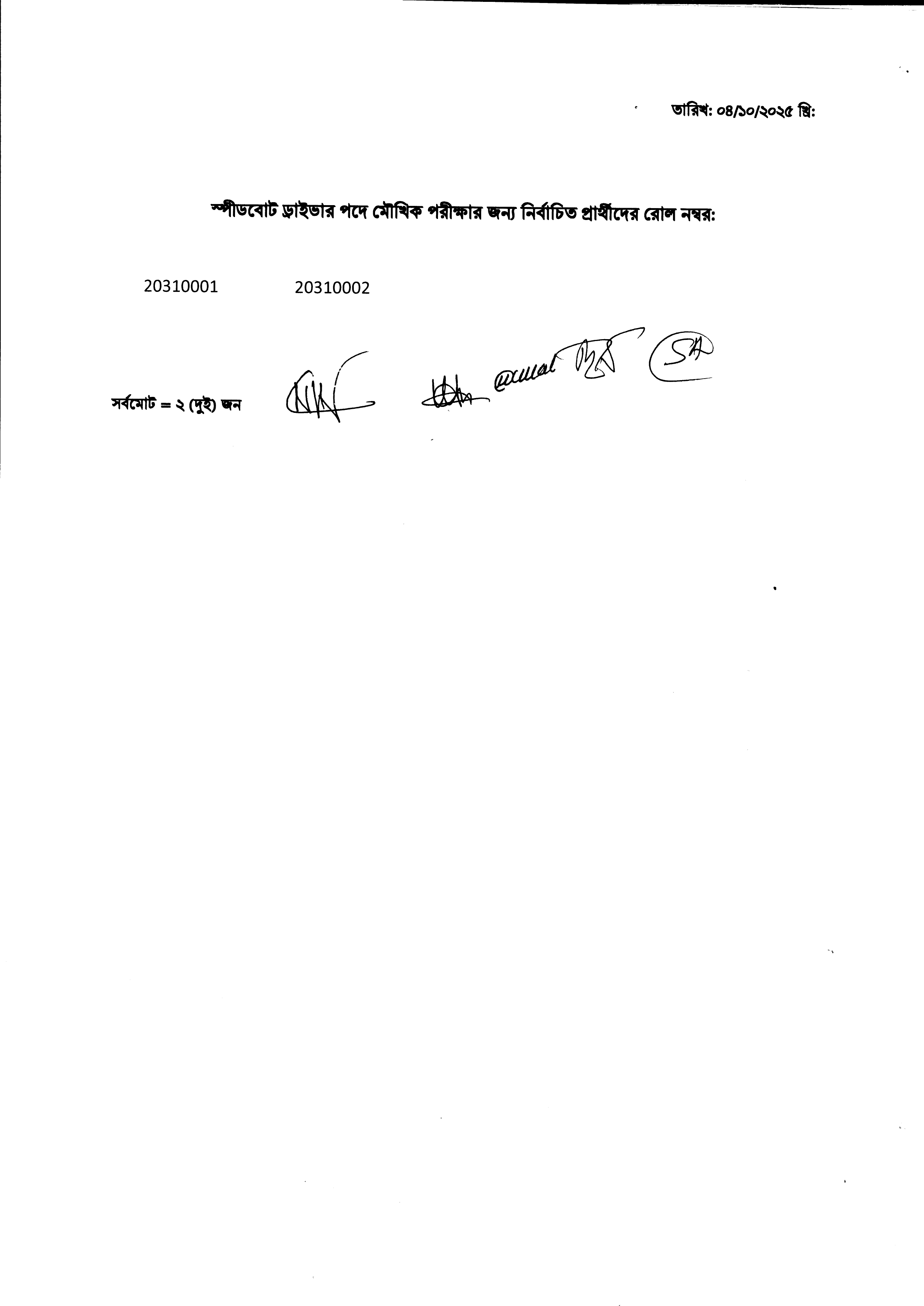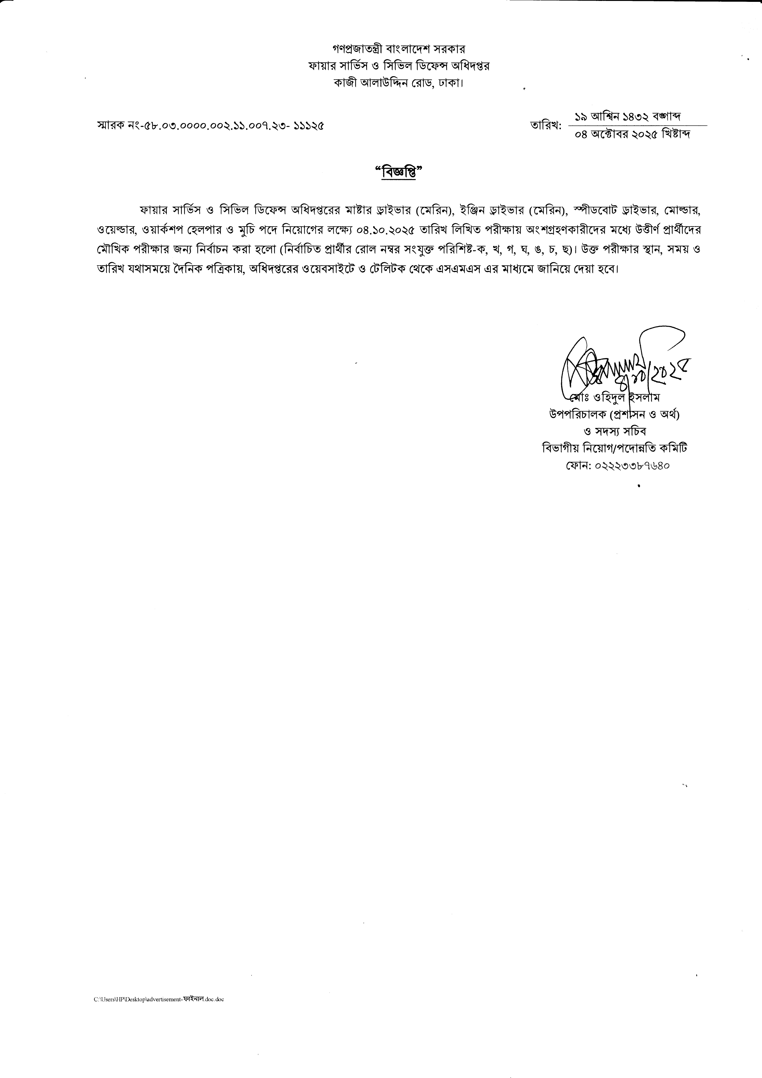 ফায়ার সার্ভিস ও সিভিল ডিফেন্স অধিদপ্তরের মাষ্টার ড্রাইভার (মেরিন), ইঞ্জিন ড্রাইভার (মেরিন), স্পীডবোট ড্রাইভার, মোল্ডার, ওয়েন্ডার, ওয়ার্কশপ হেলপার ও মুচি পদে লিখিত পরীক্ষায় উত্তীর্ণ প্রার্থীদের মৌখিক পরীক্ষার জন্য নির্বাচন করা হয়েছে। লিখিত পরীক্ষাটি ০৪.১০.২০২৫ তারিখে অনুষ্ঠিত হয়েছিল।
