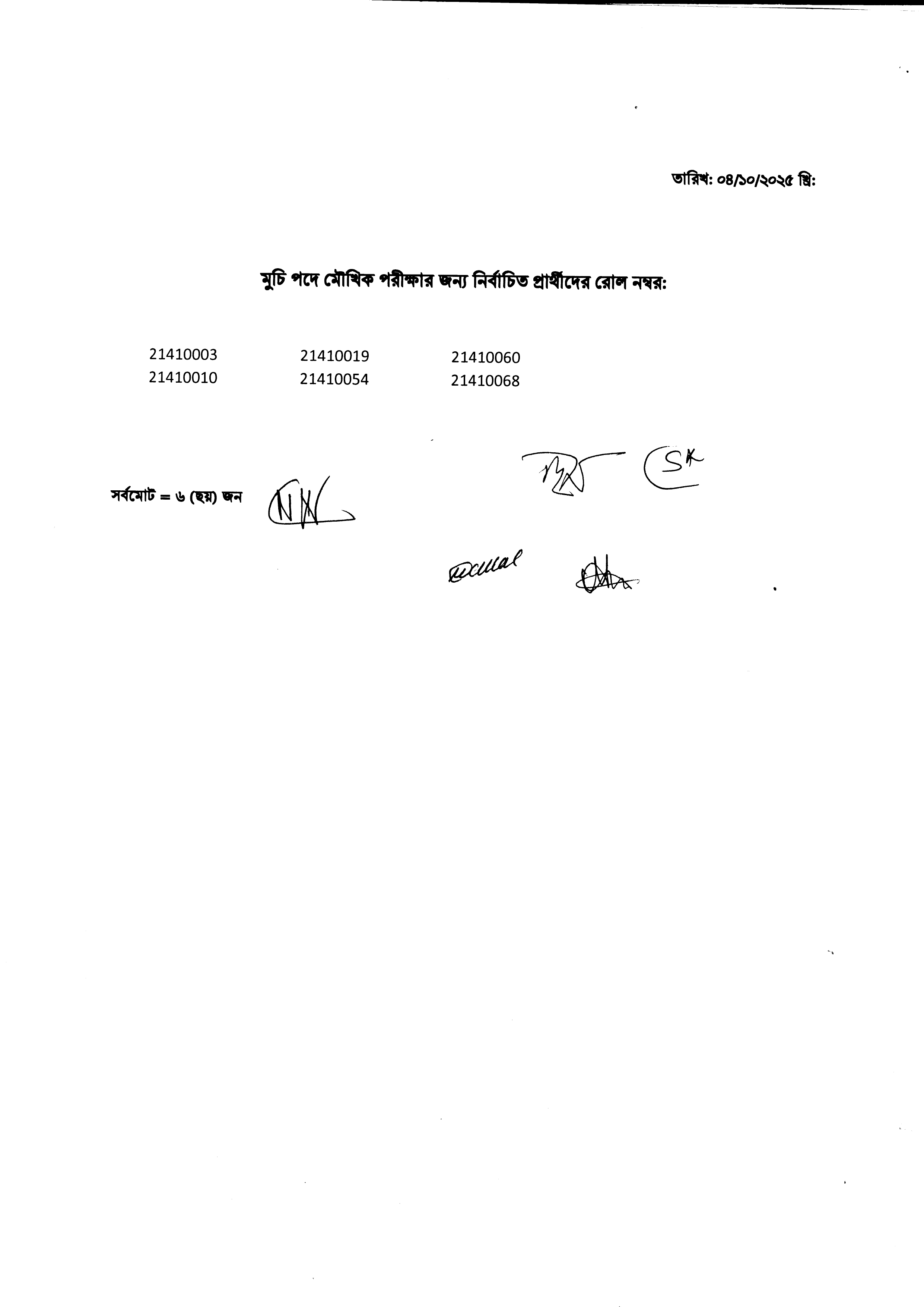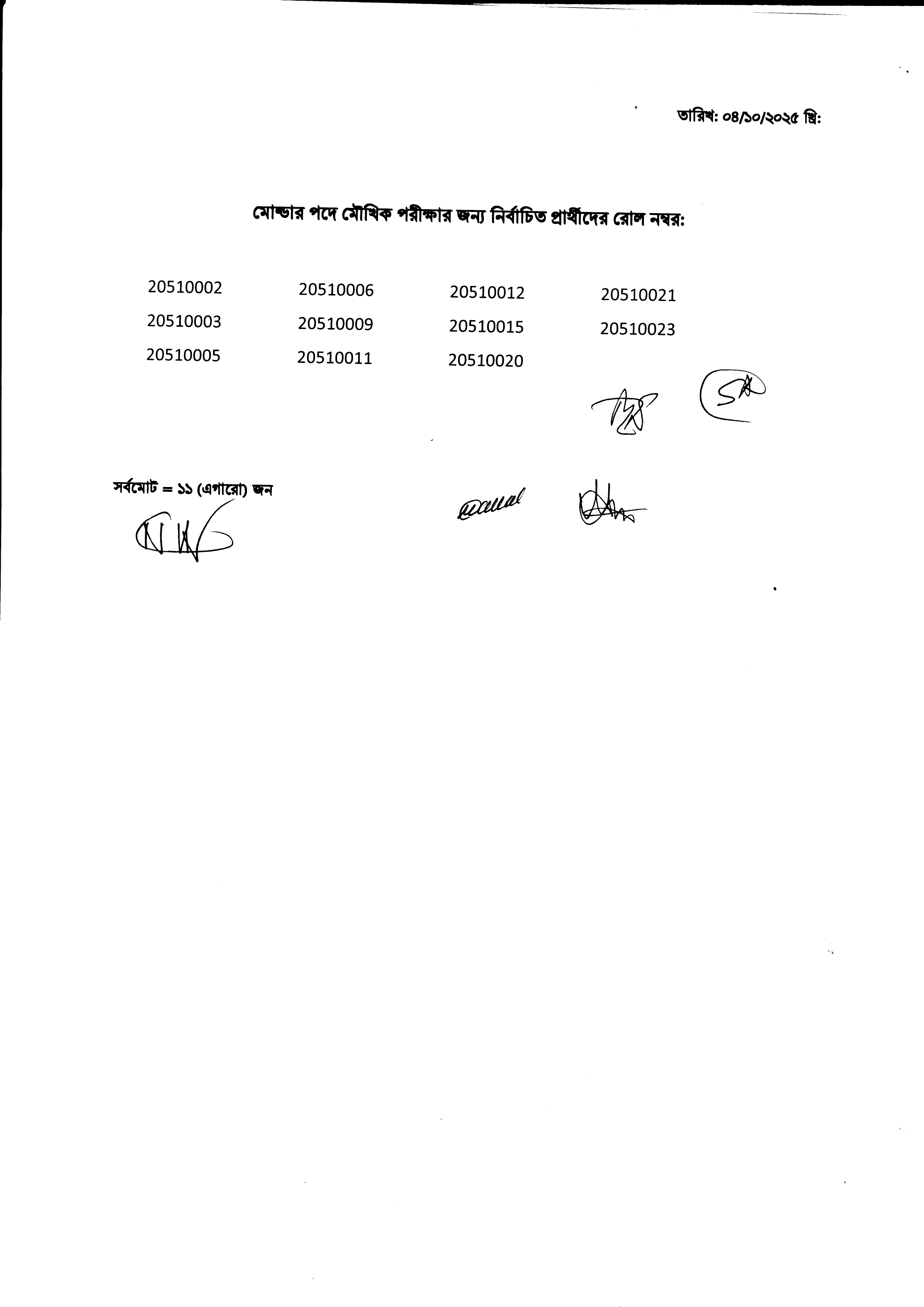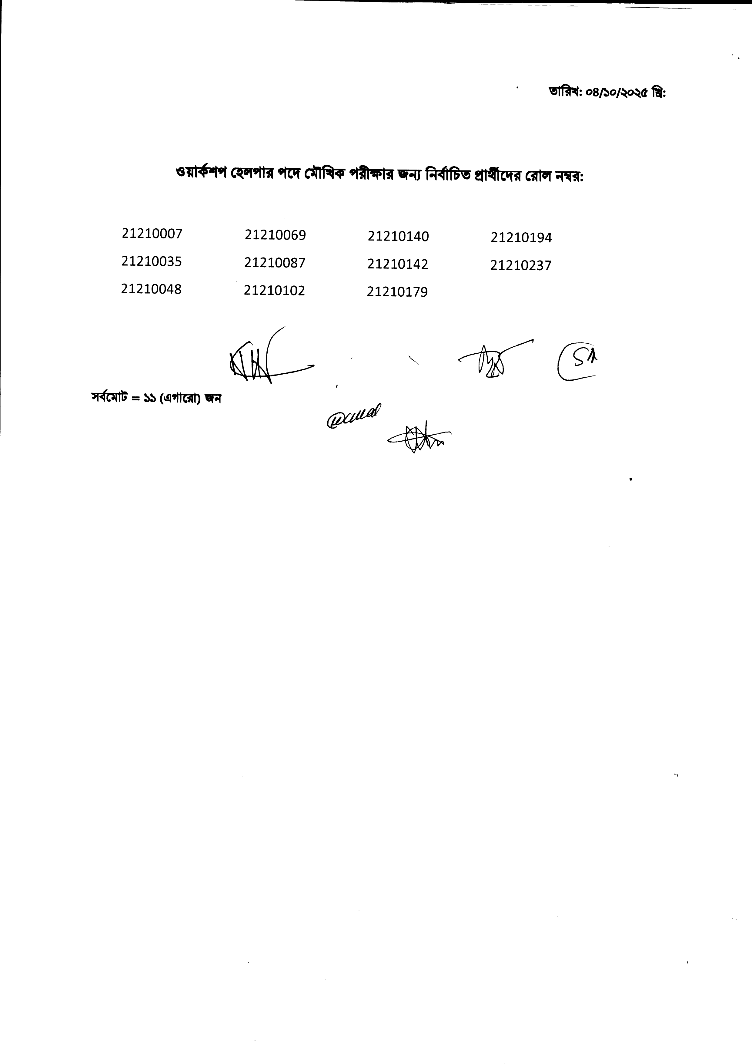 ফায়ার সার্ভিস ও সিভিল ডিফেন্স অধিদপ্তরের মাষ্টার ড্রাইভার (মেরিন), ইঞ্জিন ড্রাইভার (মেরিন), স্পীডবোট ড্রাইভার, মোল্ডার, ওয়েন্ডার, ওয়ার্কশপ হেলপার ও মুচি পদে লিখিত পরীক্ষায় উত্তীর্ণ প্রার্থীদের মৌখিক পরীক্ষার জন্য নির্বাচন করা হয়েছে। লিখিত পরীক্ষাটি ০৪.১০.২০২৫ তারিখে অনুষ্ঠিত হয়েছিল।