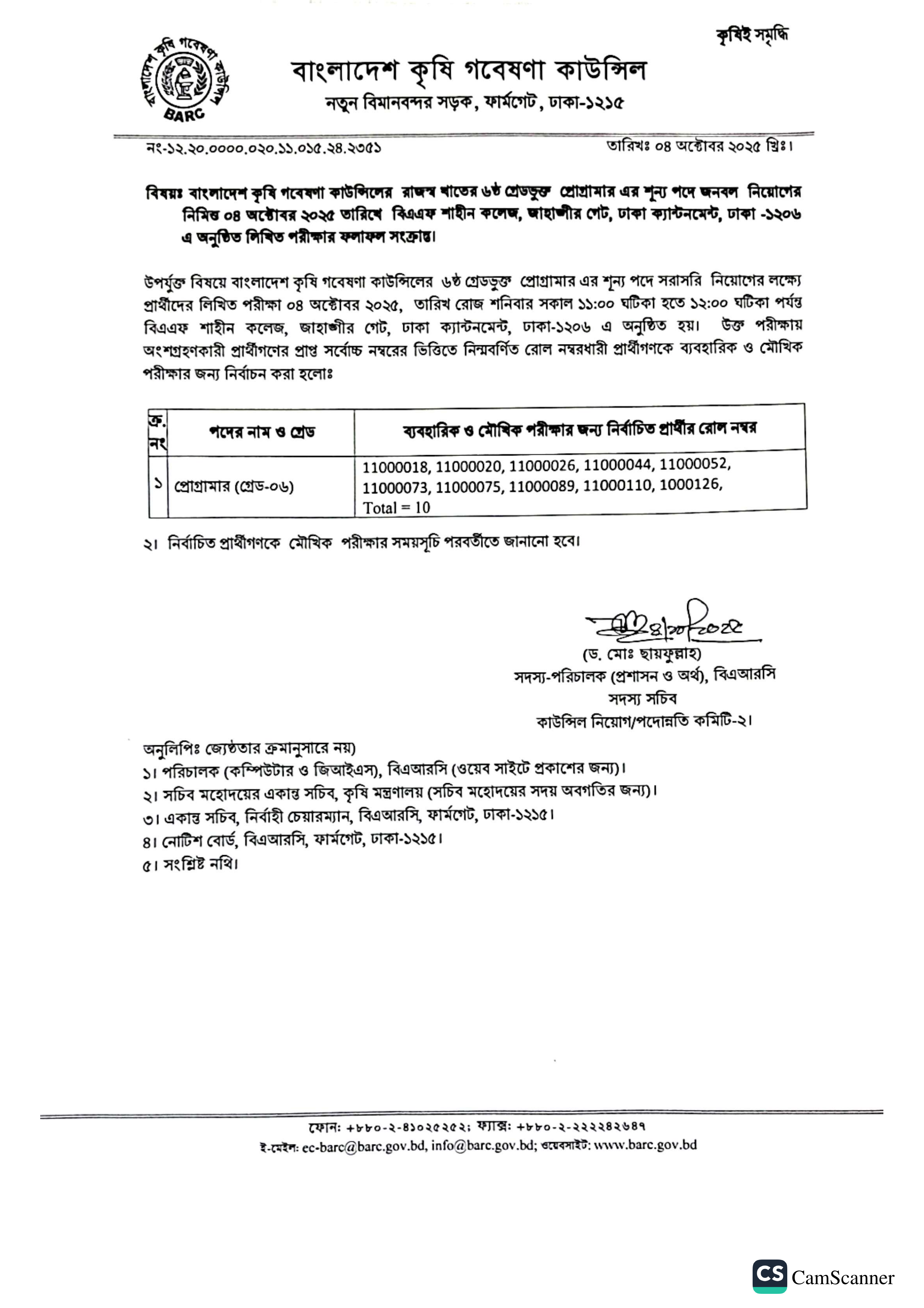 বাংলাদেশ কৃষি গবেষণা কাউন্সিল (BARC) কর্তৃক ৬ষ্ঠ গ্রেডভুক্ত প্রোগ্রামার পদের লিখিত পরীক্ষার ফলাফল প্রকাশ করা হয়েছে।