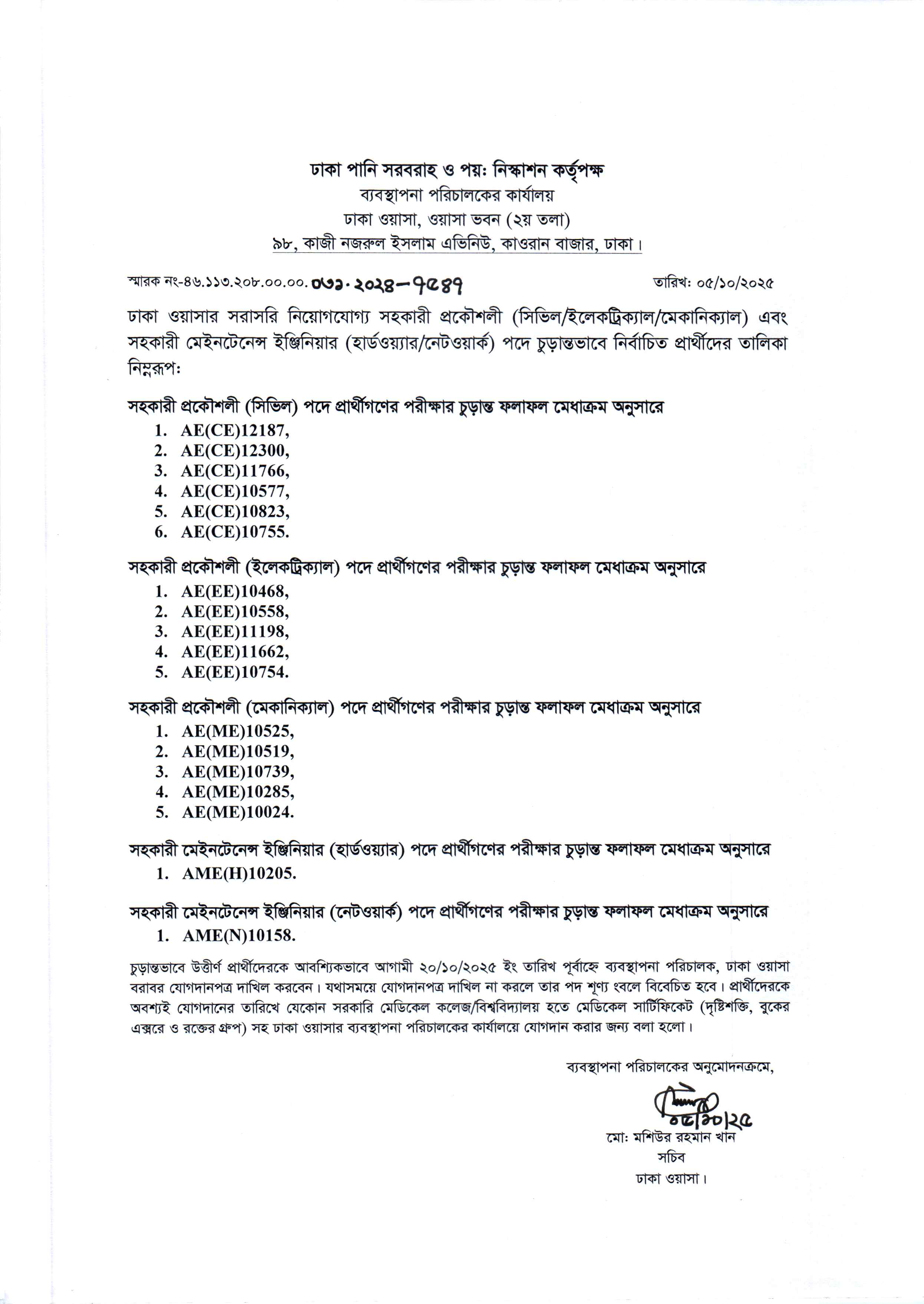 চূড়ান্তভাবে উত্তীর্ণ প্রার্থীদেরকে আগামী ২০/১০/২০২৫ ইং তারিখ পূর্বাহ্নে ব্যবস্থাপনা পরিচালক, ঢাকা ওয়াসা বরাবর যোগদানপত্র দাখিল করতে হবে।