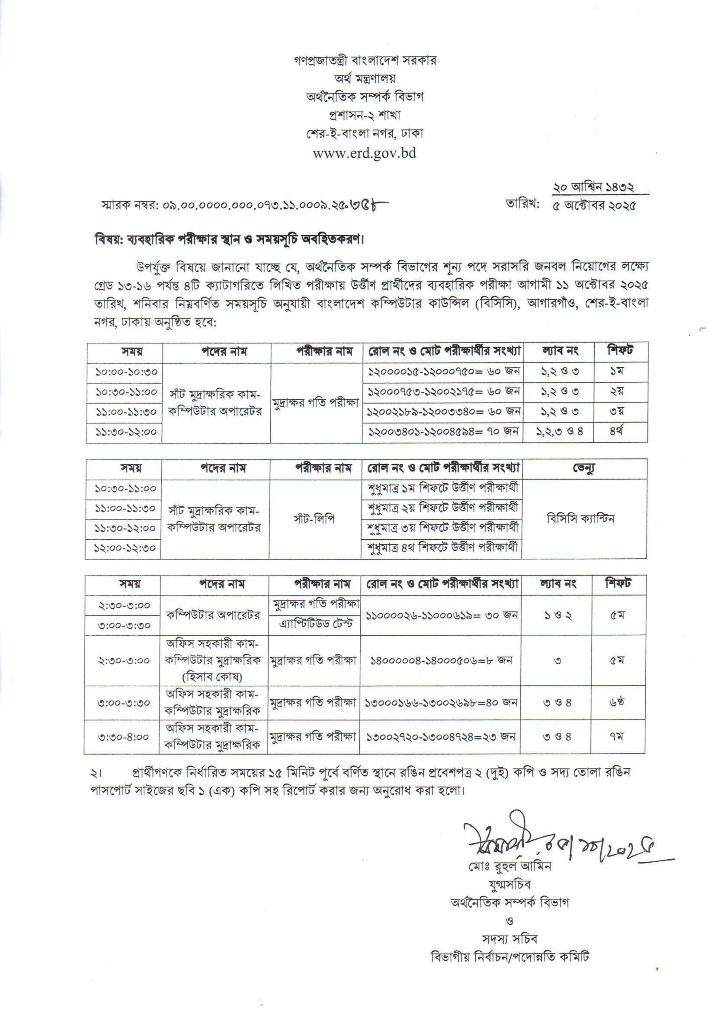 অর্থ মন্ত্রণালয়ের অর্থনৈতিক সম্পর্ক বিভাগ-এর শূন্য পদে সরাসরি জনবল নিয়োগের লক্ষ্যে গ্রেড ১৩-১৬ পর্যন্ত ৮৪টি ক্যাটাগরিতে লিখিত পরীক্ষায় উত্তীর্ণ প্রার্থীদের ব্যবহারিক পরীক্ষার স্থান ও সময়সূচি প্রকাশিত হয়েছে।