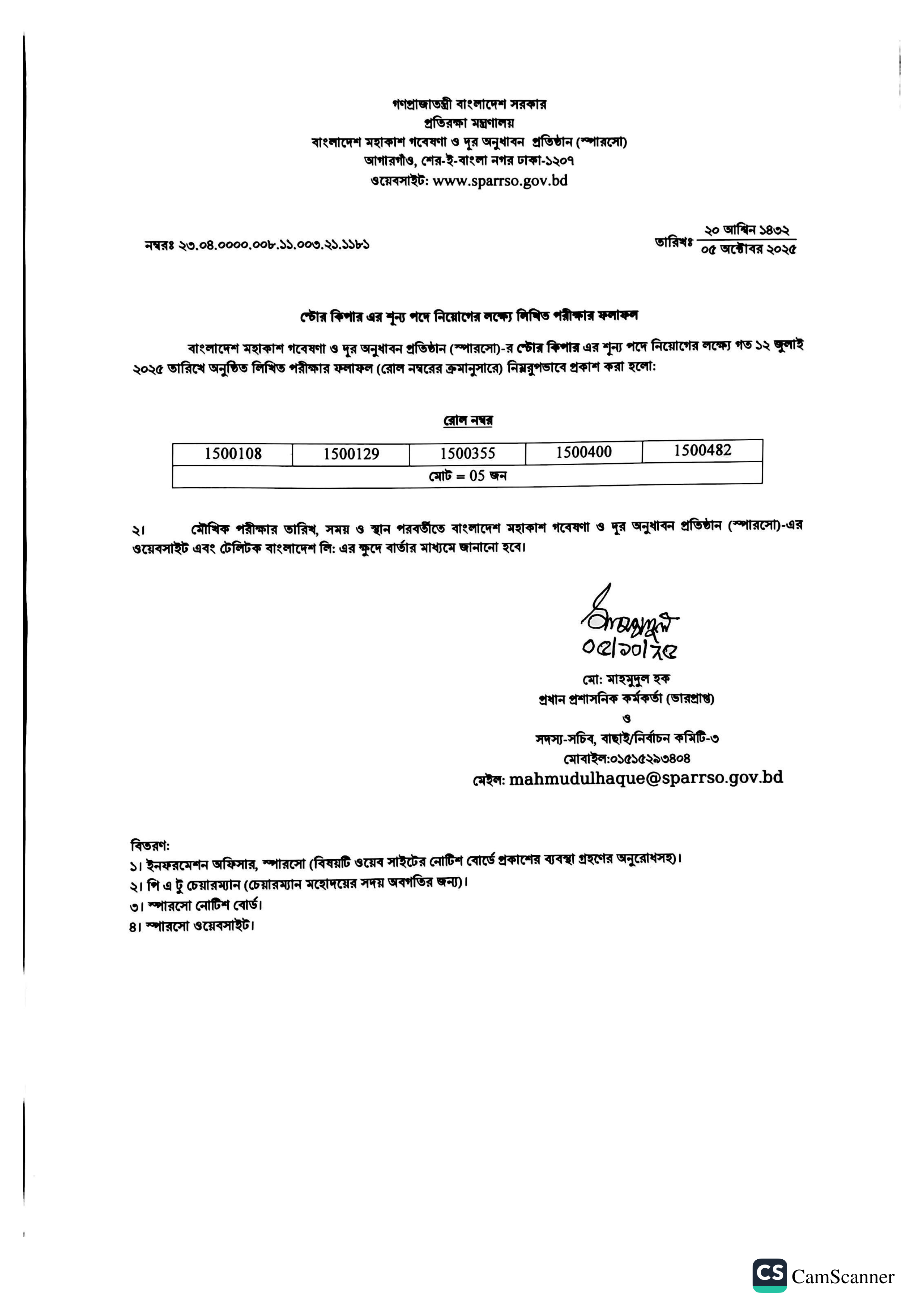 বাংলাদেশ মহাকাশ গবেষণা ও দুর অনুধাবন প্রতিষ্ঠান (স্পারসো)-এর স্টোর কিপার শূন্য পদের নিয়োগের লক্ষ্যে গত ১২ জুলাই ২০২৫ তারিখে অনুষ্ঠিত লিখিত পরীক্ষার ফলাফল প্রকাশিত হয়েছে।