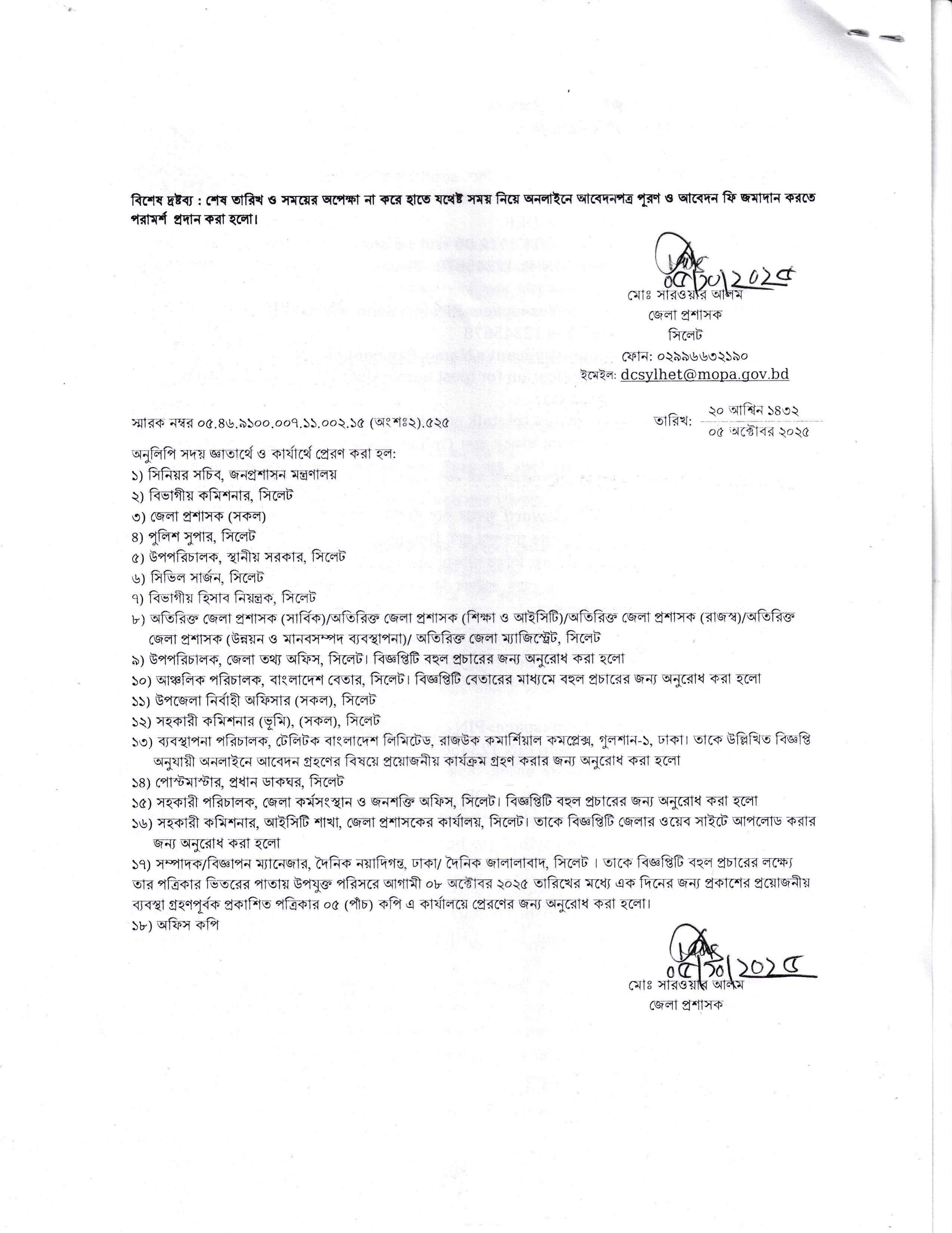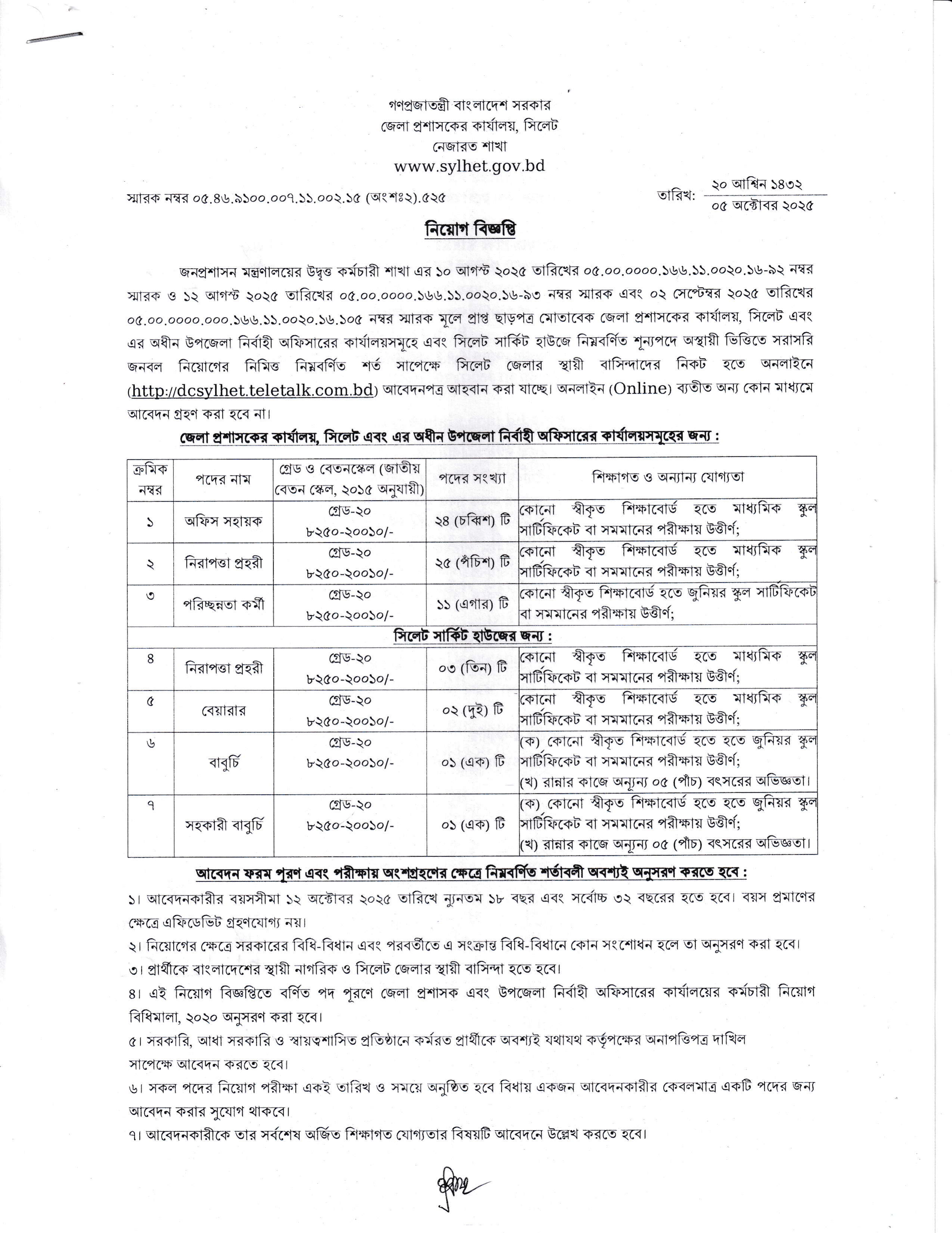জেলা প্রশাসকের কার্যালয়, সিলেট এবং এর অধীন উপজেলা নির্বাহী অফিসারের কার্যালয়সমূহে এবং সিলেট সার্কিট হাউজে নিম্নবর্ণিত শূন্যপদে জনবল নিয়োগের জন্য নতুন বিজ্ঞপ্তি প্রকাশিত হয়েছে। সিলেট জেলার স্থায়ী বাসিন্দাদের নিকট হতে অনলাইনে আবেদন আহ্বান করা হয়েছে।
