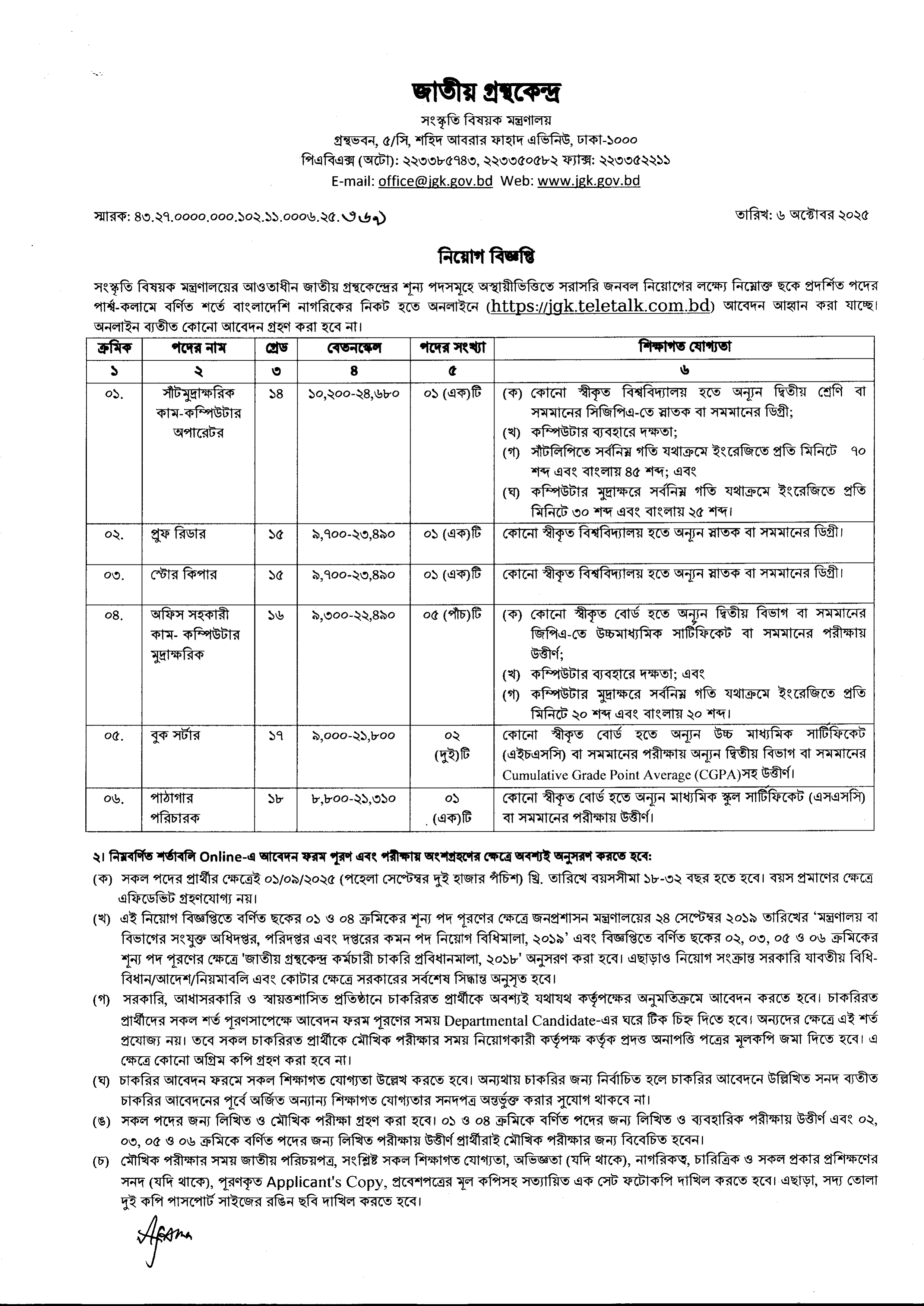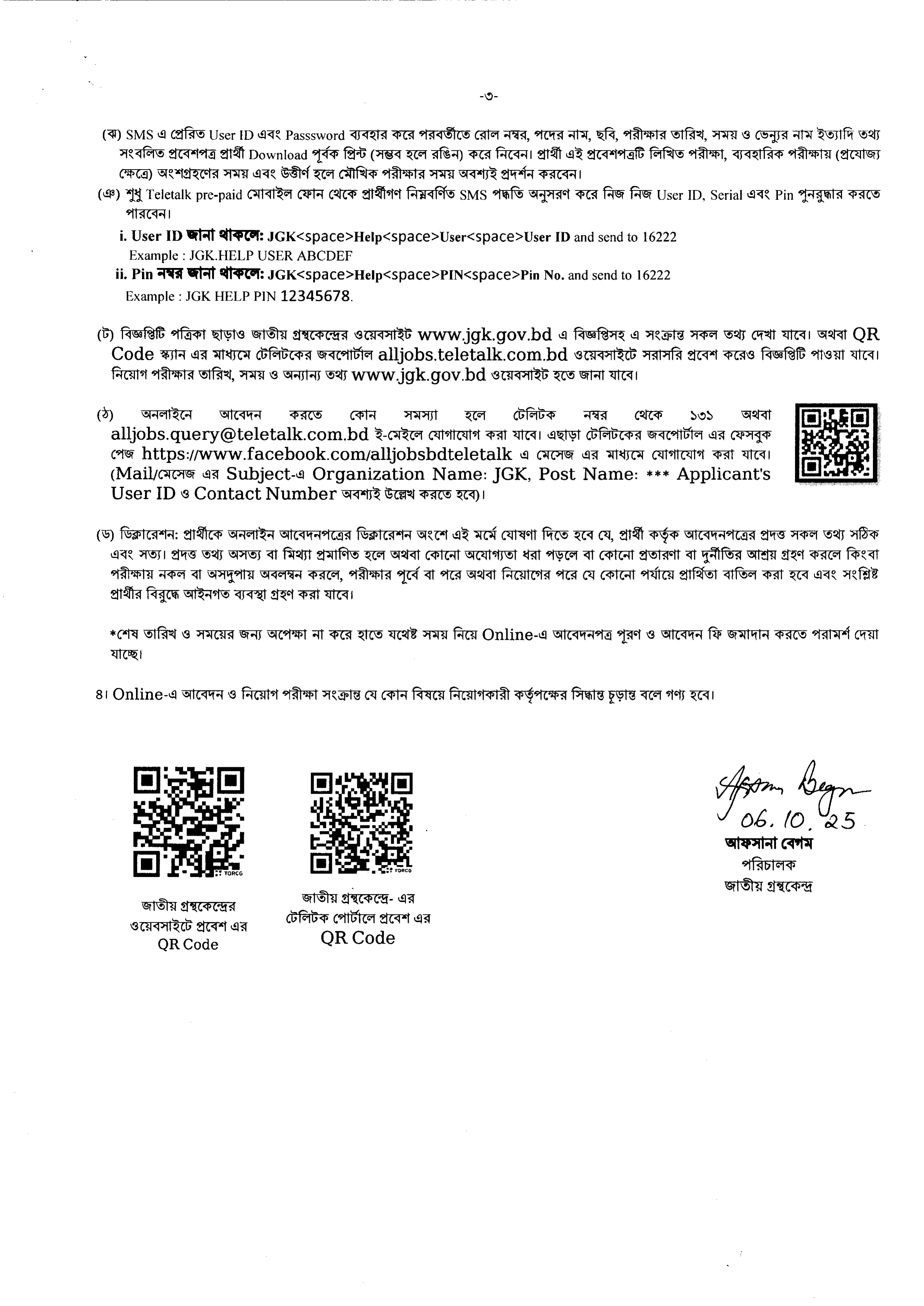 পরীক্ষার তথ্য: নিয়োগ পরীক্ষার তারিখ, সময় ও অন্যান্য তথ্য জাতীয় গ্রন্থকেন্দ্রের ওয়েবসাইট (www.jgk.gov.bd) এবং প্রার্থীর মোবাইল ফোনে SMS এর মাধ্যমে যথাসময়ে জানানো হবে।