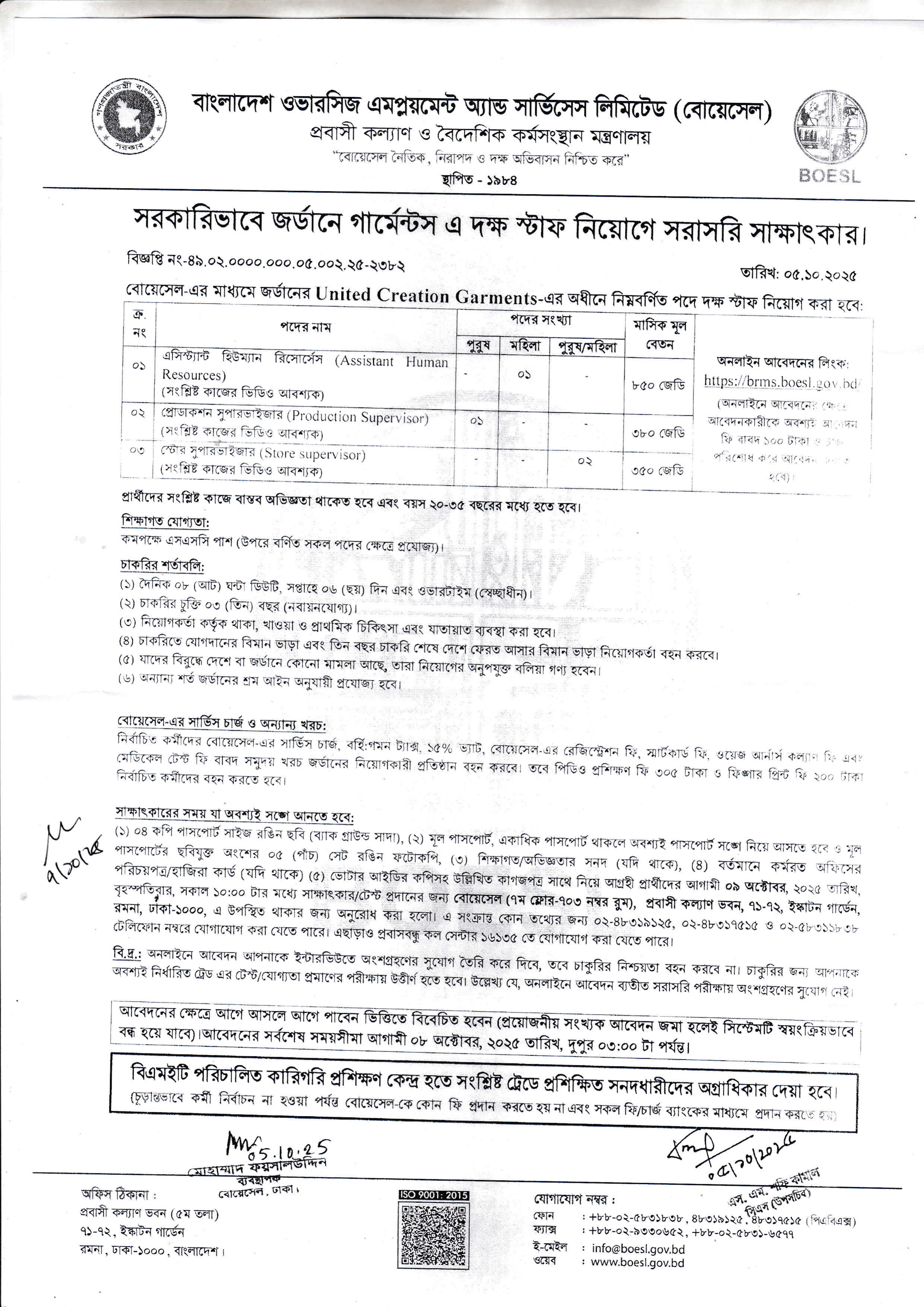 বাংলাদেশ ওভারসিজ এমপ্লয়মেন্ট আ্যান্ড সার্ভিসেস লিমিটেড (বোয়েসেল) এর মাধ্যমে জর্ডানের একটি স্বনামধন্য কোম্পানিতে নিম্নলিখিত পদে দক্ষ স্টাফ নিয়োগ করা হবে: