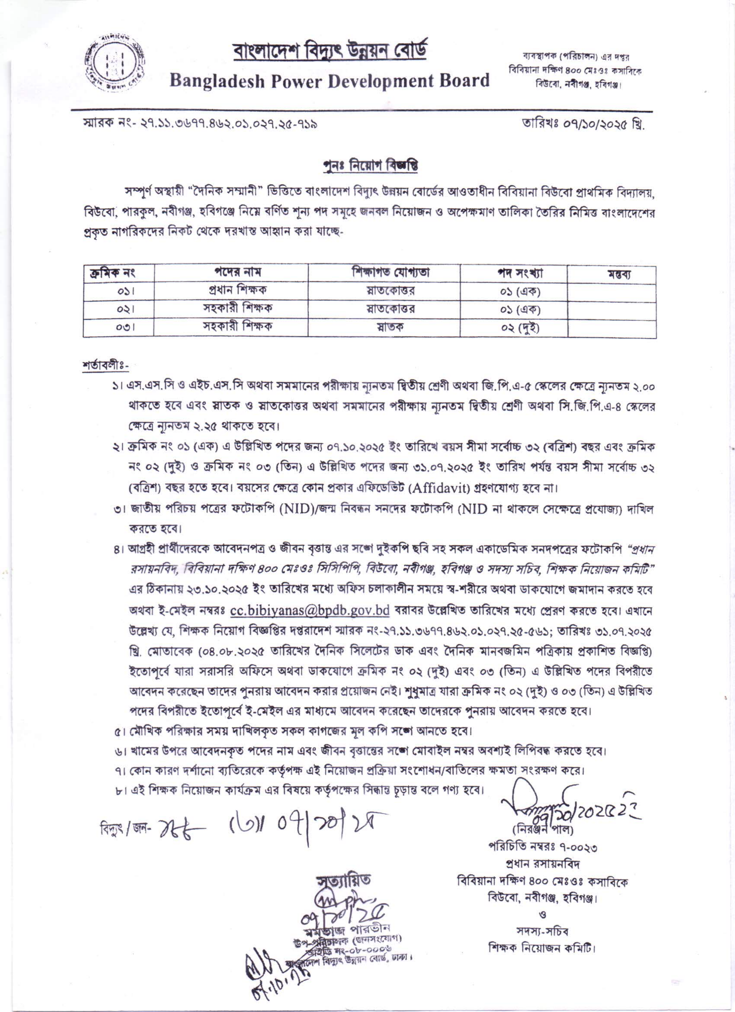 বাংলাদেশ বিদ্যুৎ উন্নয়ন বোর্ডের আওতাধীন বিবিয়ানা বিউবো প্রাথমিক বিদ্যালয়, বিউবো, পারকুল, নবীগঞ্জ, হবিগঞ্জ-এ সম্পূর্ণ অস্থায়ী 'দৈনিক সম্মানী' ভিত্তিতে জনবল নিয়োগের জন্য একটি বিজ্ঞপ্তি প্রকাশিত হয়েছে। এই বিজ্ঞপ্তিতে সর্বমোট ৪টি শূন্য পদে লোকবল নিয়োগ করা হবে।