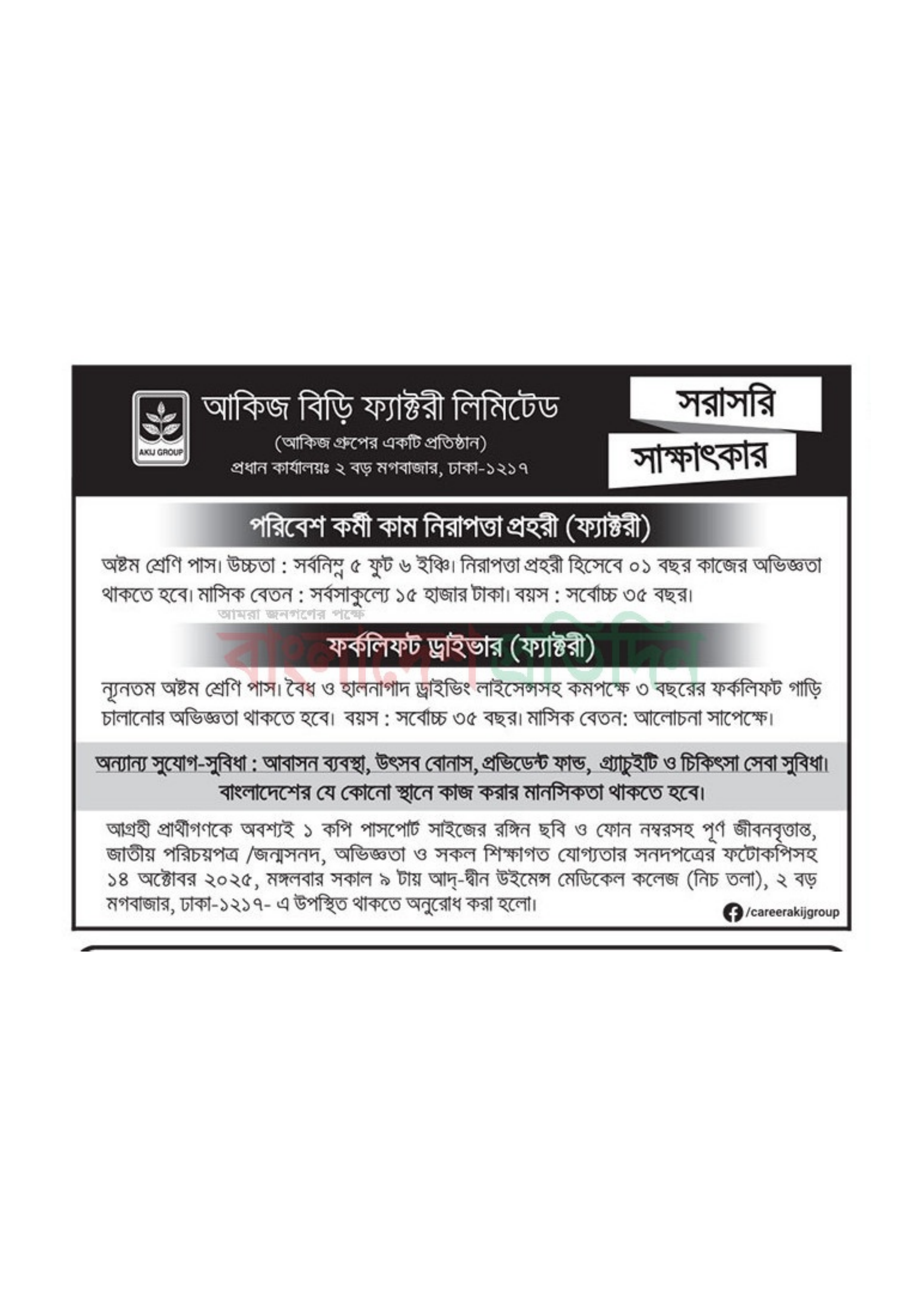 আকিজ গ্রুপের একটি স্বনামধন্য প্রতিষ্ঠানে পরিবেশ কর্মী কাম নিরাপত্তা প্রহরী (ফ্যাক্টরী) এবং ফর্কলিফট অপারেটর পদে জনবল নিয়োগের জন্য বিজ্ঞপ্তি প্রকাশ করা হয়েছে। আগ্রহী ও যোগ্য প্রার্থীরা ওয়াক-ইন ইন্টারভিউর মাধ্যমে আবেদন করতে পারবেন।