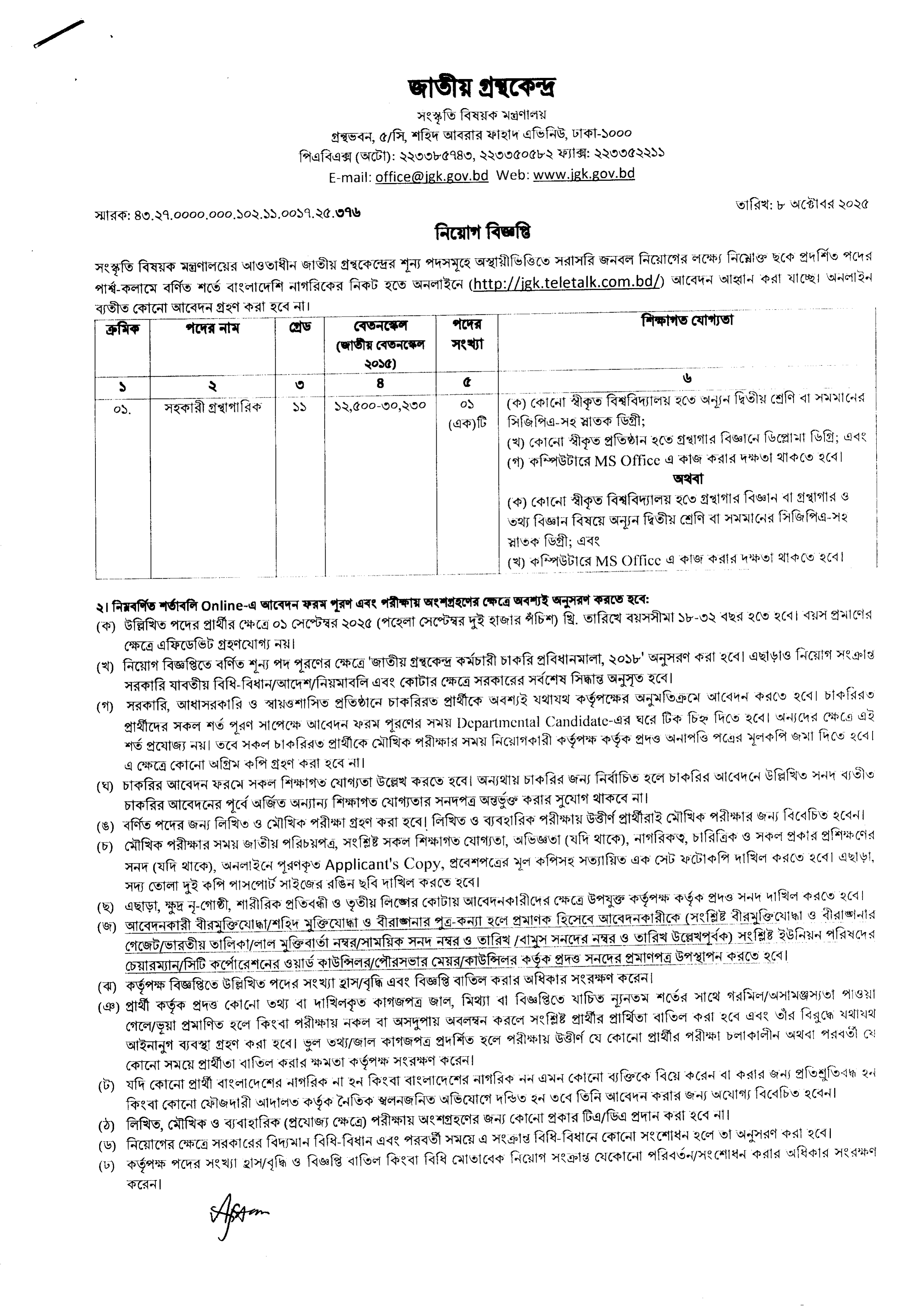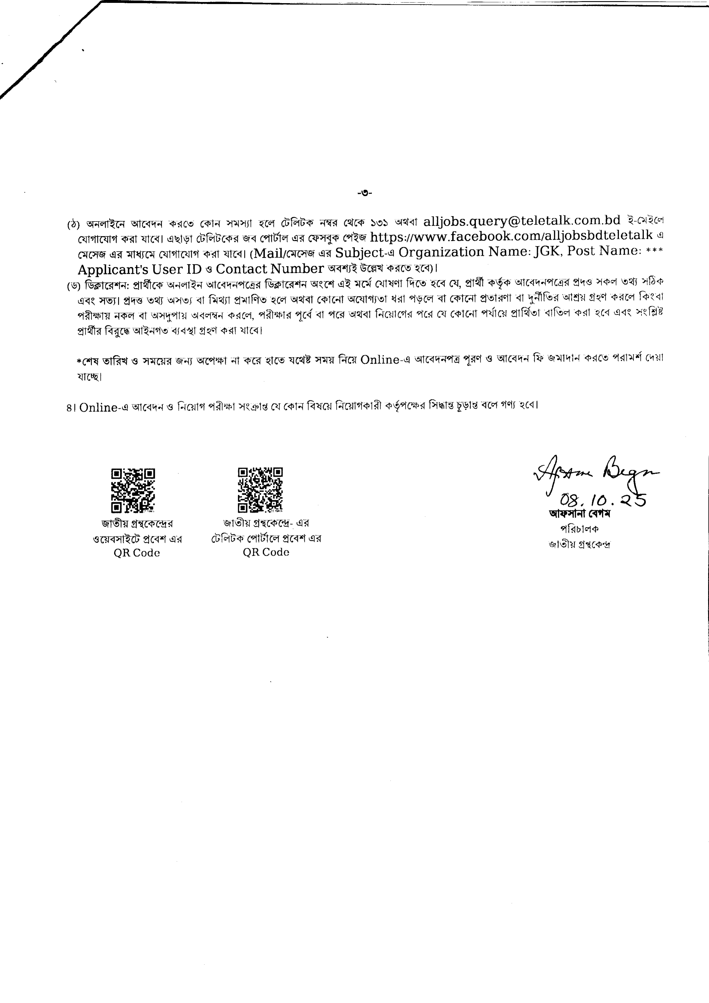 পরীক্ষার তথ্য: বর্ণিত পদের জন্য লিখিত ও মৌখিক পরীক্ষা গ্রহণ করা হবে। পরীক্ষার তারিখ, সময় ও স্থান প্রবেশপত্রের মাধ্যমে এবং জাতীয় গ্রন্থকেন্দ্রের ওয়েবসাইট অথবা Teletalk.com.bd ওয়েবসাইটে যথাসময়ে জানানো হবে।