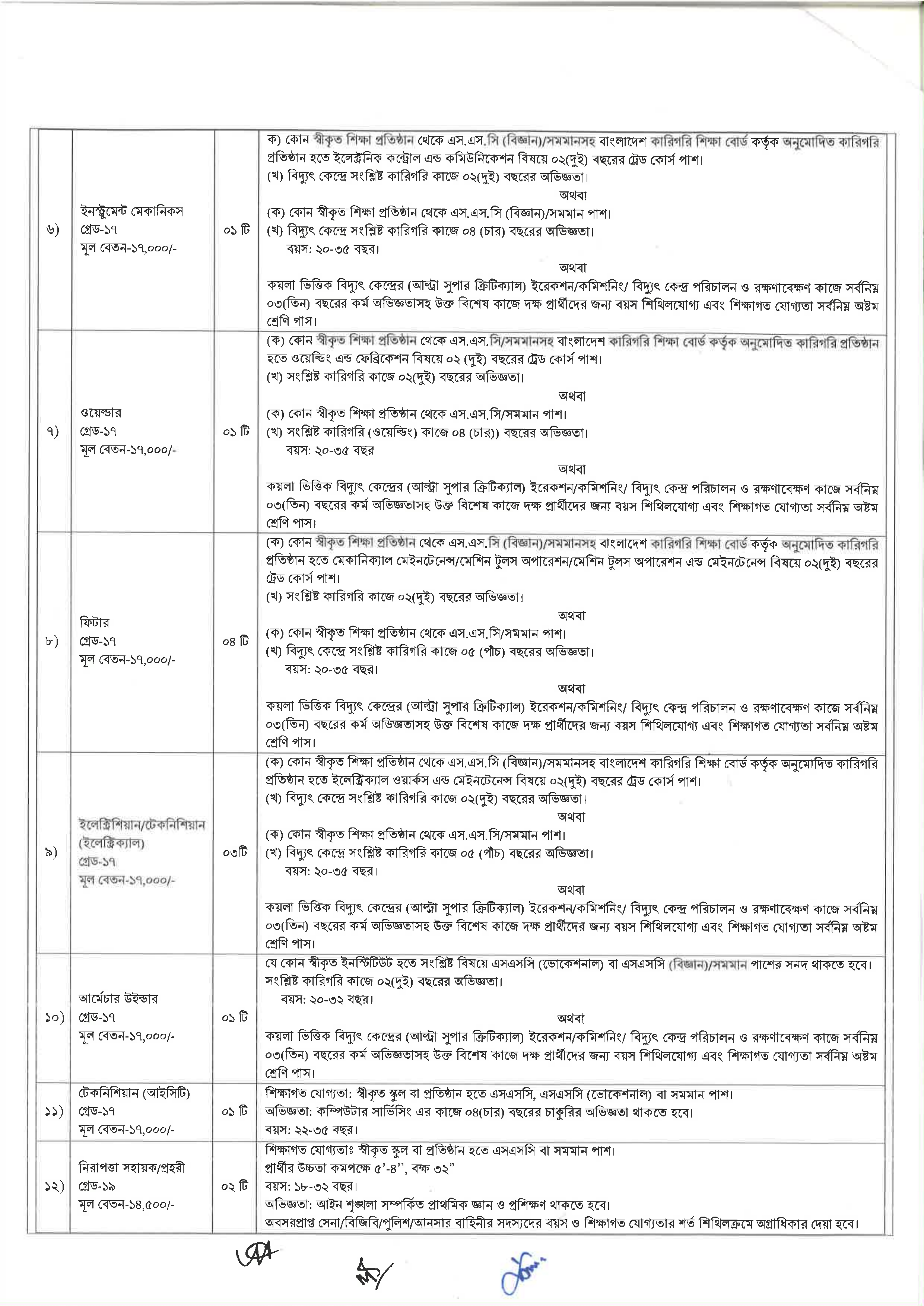 শিক্ষাগত যোগ্যতা: পদভেদে এসএসসি/সমমান, ট্রেড কোর্স, জেএসসি/অষ্টম শ্রেণি পাশ এবং সংশ্লিষ্ট কাজে অভিজ্ঞতা প্রয়োজন।