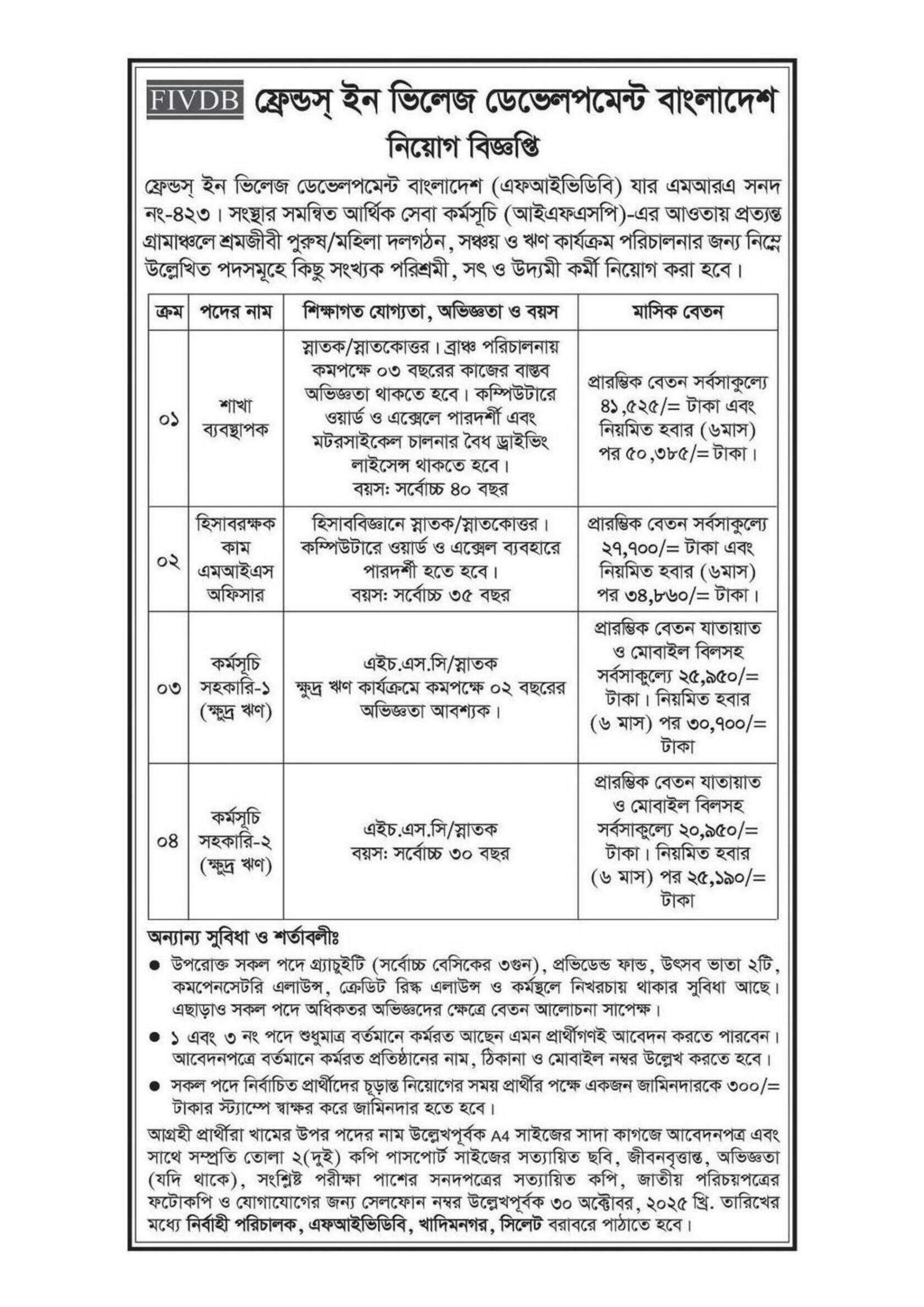 ফ্রেন্ডস্ ইন ভিলেজ ডেভেলপমেন্ট বাংলাদেশ (এফআইভিডিবি) তাদের সমন্বিত আর্থিক সেবা কর্মসূচি (আইএফএসপি)-এর আওতায় প্রত্যন্ত গ্রামাঞ্চলে শ্রমজীবী পুরুষ/মহিলা দলগঠন, সঞ্চয় ও ঋণ কার্যক্রম পরিচালনার জন্য কিছু সংখ্যক পরিশ্রমী, সৎ ও উদ্যমী কর্মী নিয়োগ করবে।