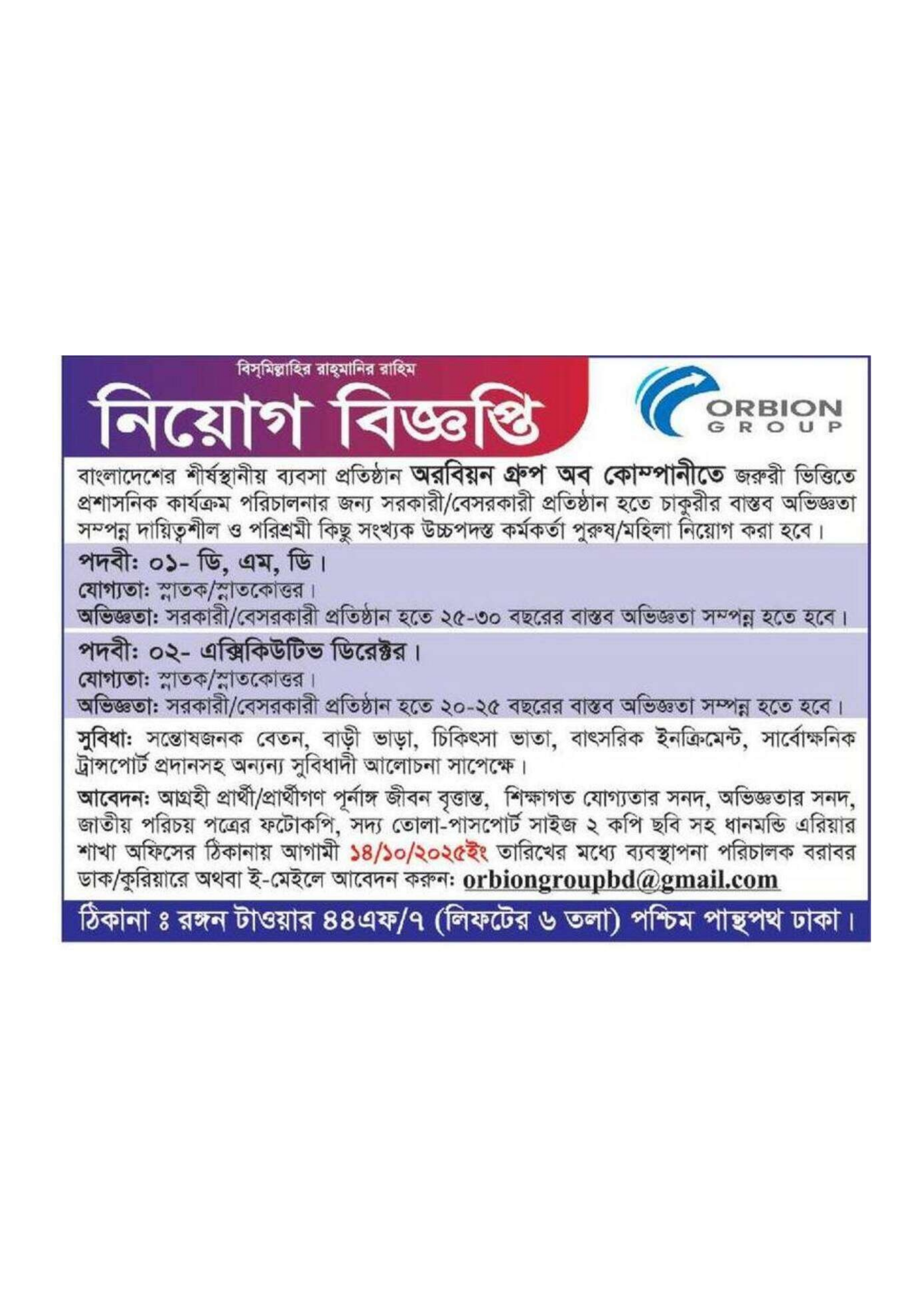 বাংলাদেশের শীর্ষস্থানীয় ব্যবসা প্রতিষ্ঠান অরবিয়ন গ্রুপ অব কোম্পানীতে জরুরি ভিত্তিতে প্রশাসনিক কার্যক্রম পরিচালনার জন্য উচ্চপদস্থ কর্মকর্তা নিয়োগের বিজ্ঞপ্তি প্রকাশিত হয়েছে।