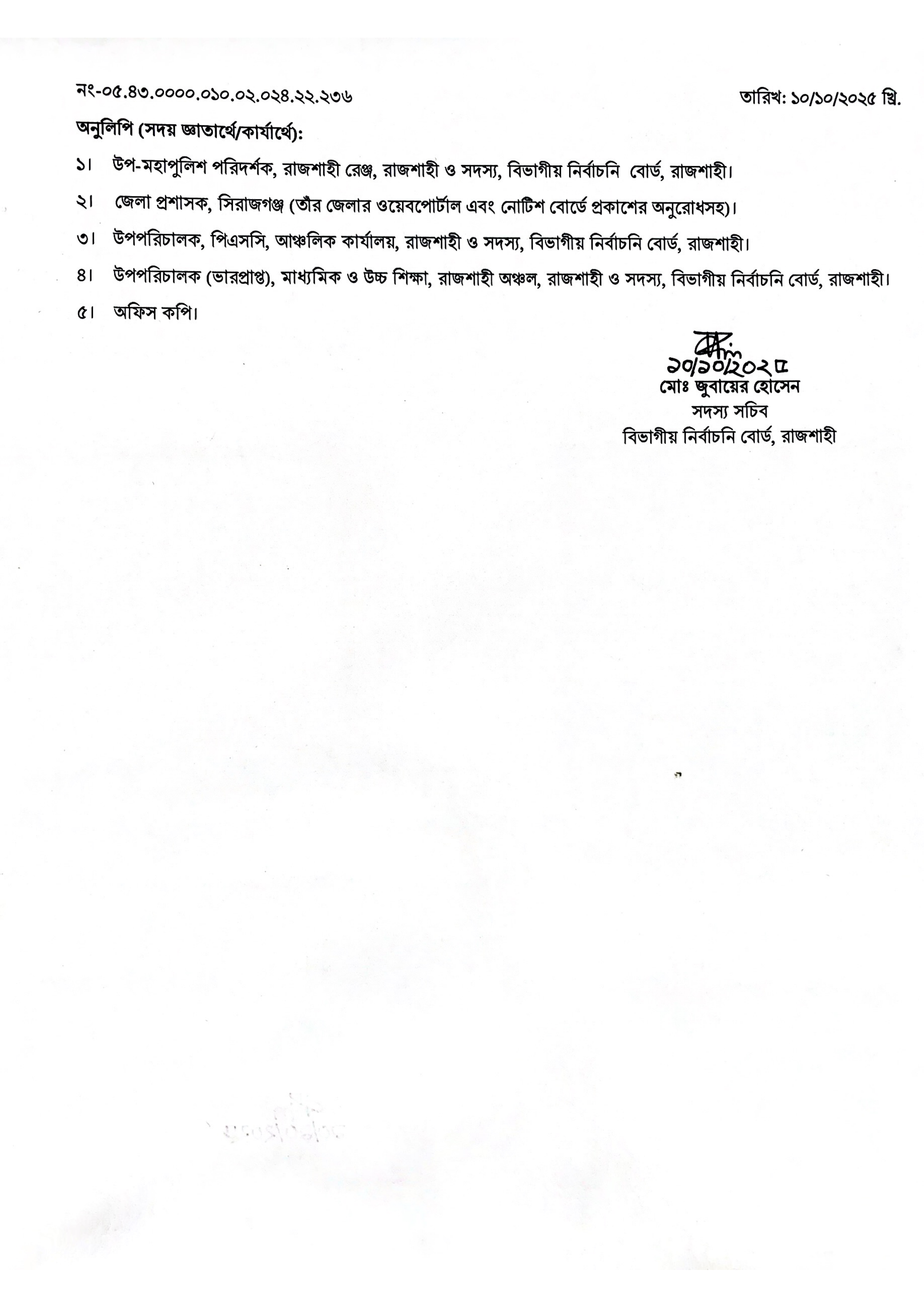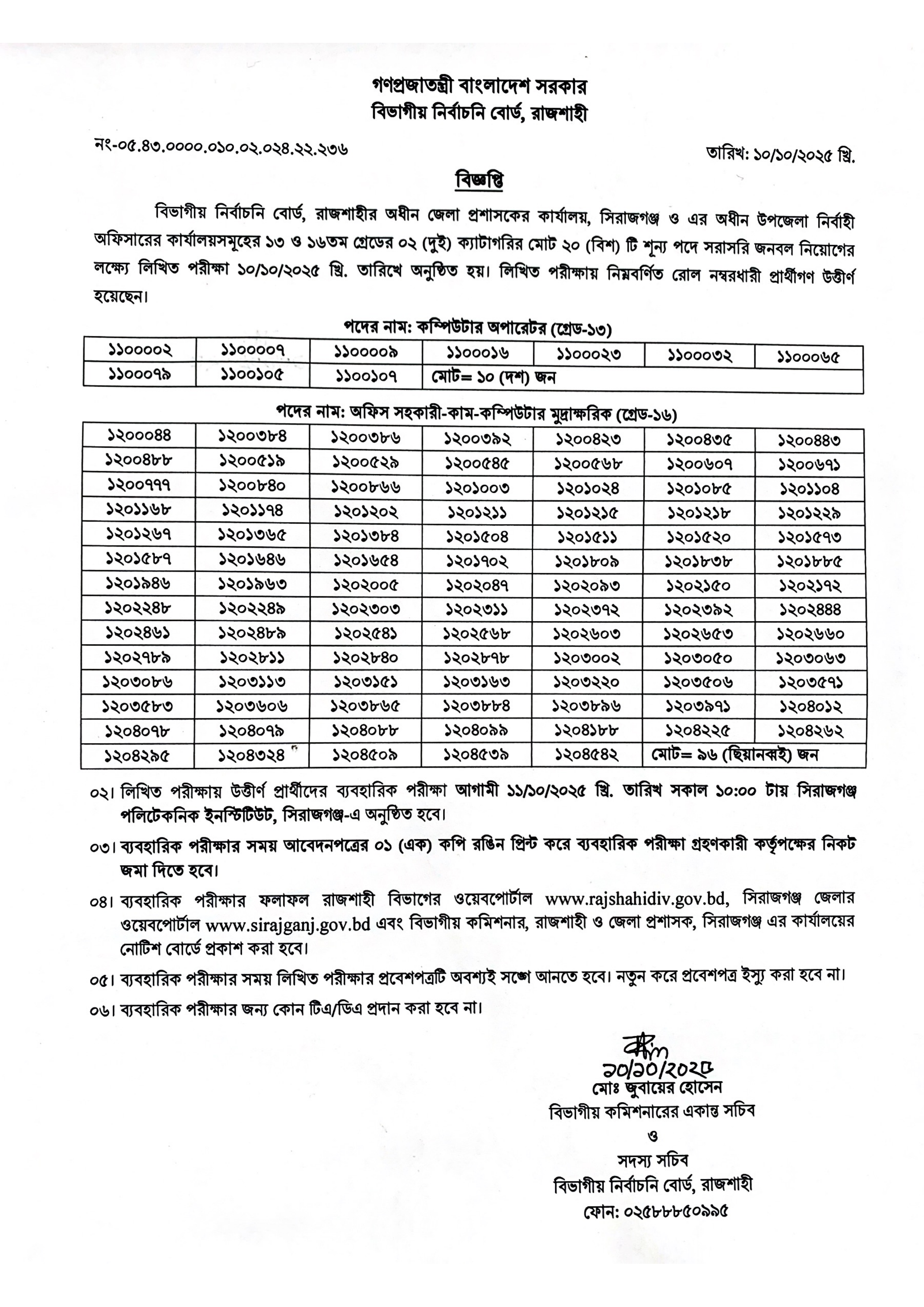 বিভাগীয় নির্বাচনি বোর্ড, রাজশাহীর অধীন জেলা প্রশাসকের কার্যালয়, সিরাজগঞ্জ এবং এর অধীন উপজেলা নির্বাহী অফিসারের কার্যালয়সমূহের ১৩ ও ১৬তম গ্রেডের মোট ২০ (বিশ) টি শূন্য পদে সরাসরি জনবল নিয়োগের লক্ষ্যে অনুষ্ঠিত লিখিত পরীক্ষার ফলাফল প্রকাশিত হয়েছে।
