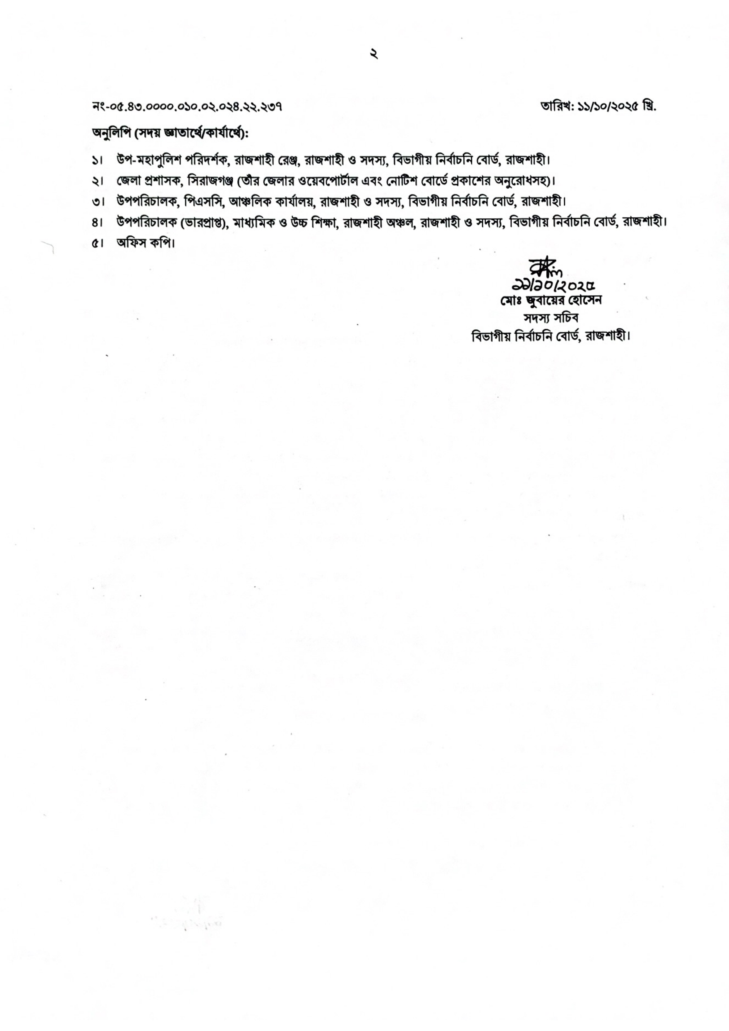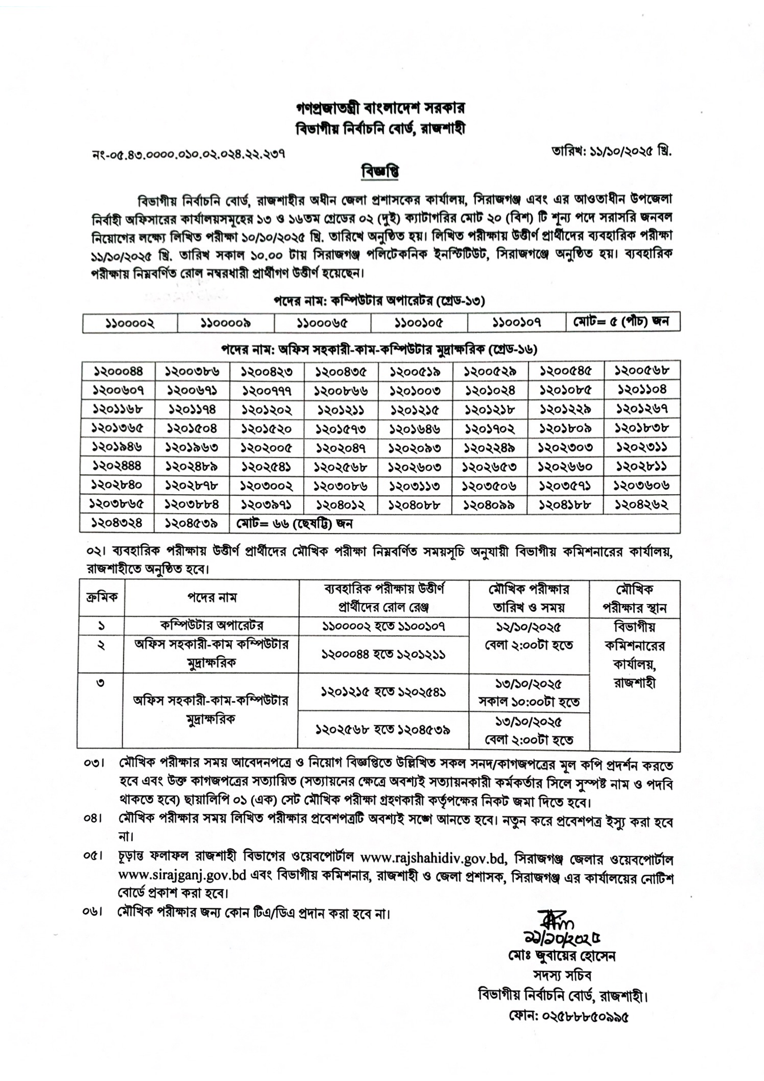 ব্যবহারিক পরীক্ষায় উত্তীর্ণ প্রার্থীদের মৌখিক পরীক্ষা আগামী ১৩/১০/২০২৫ খ্রি. তারিখে বিভাগীয় কমিশনারের কার্যালয়, রাজশাহী-তে অনুষ্ঠিত হবে। মৌখিক পরীক্ষা দুটি ব্যাচে অনুষ্ঠিত হবে: সকাল ১০:০০টা হতে এবং বেলা ২:০০টা হতে।