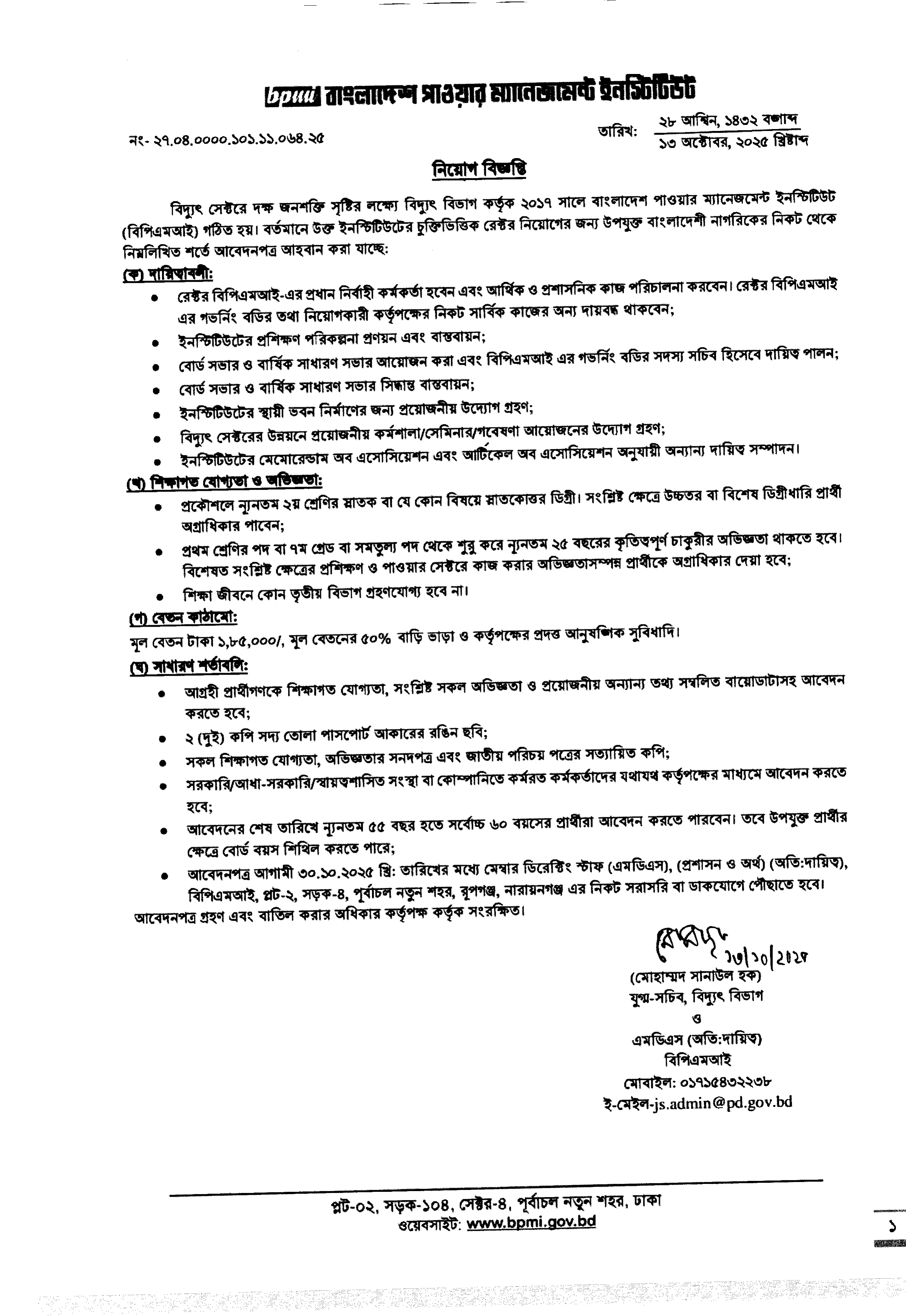 বিদ্যুৎ সেক্টরে দক্ষ জনশক্তি সৃষ্টির লক্ষ্যে গঠিত বাংলাদেশ পাওয়ার ম্যানেজমেন্ট ইনস্টিটিউট (বিপিএমআই)-এ চুক্তিভিত্তিক রেক্টর নিয়োগের জন্য উপযুক্ত বাংলাদেশী নাগরিকদের নিকট থেকে আবেদনপত্র আহবান করা হয়েছে।